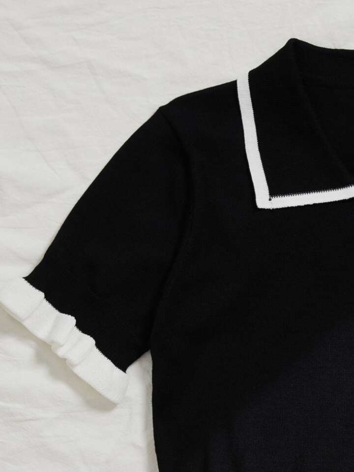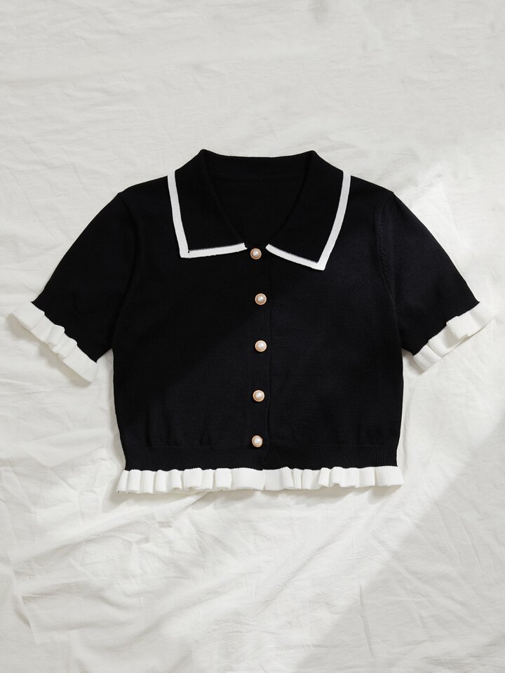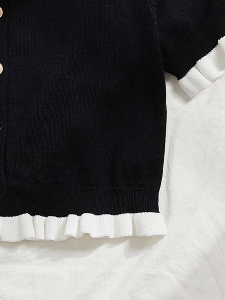 Cárdigan con botones, ribete de contraste y volantes, Tops de manga corta