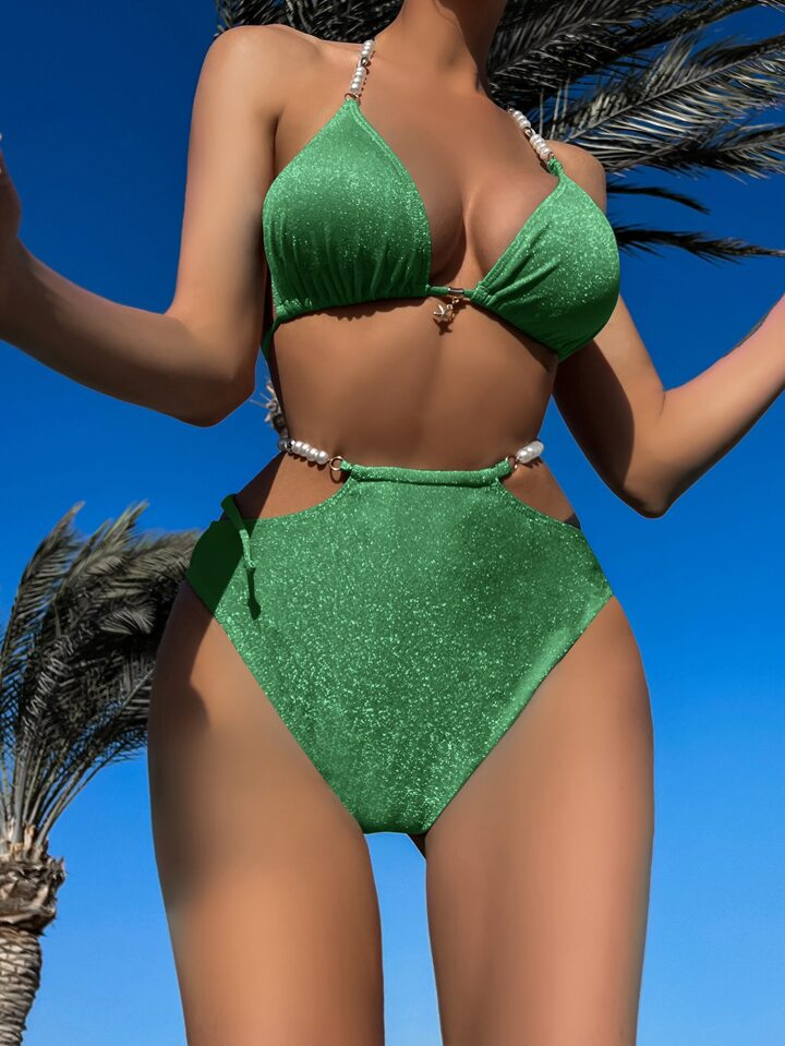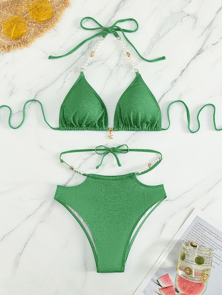 Conjunto de bikini de verano de playa con cadena de perlas detallada y sujetador de halter en triángulo
