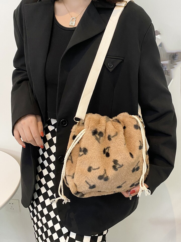 Bolso bandolera con patrón de cereza con diseño de cordón de peluche
