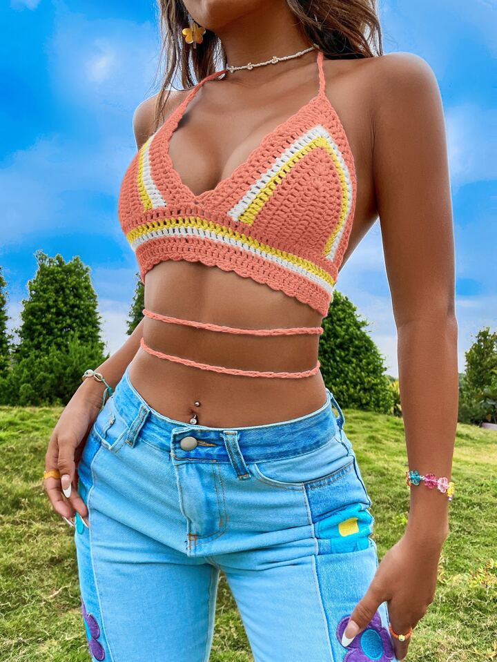 Top tejido corto de color combinado de espalda abierta de cuello halter