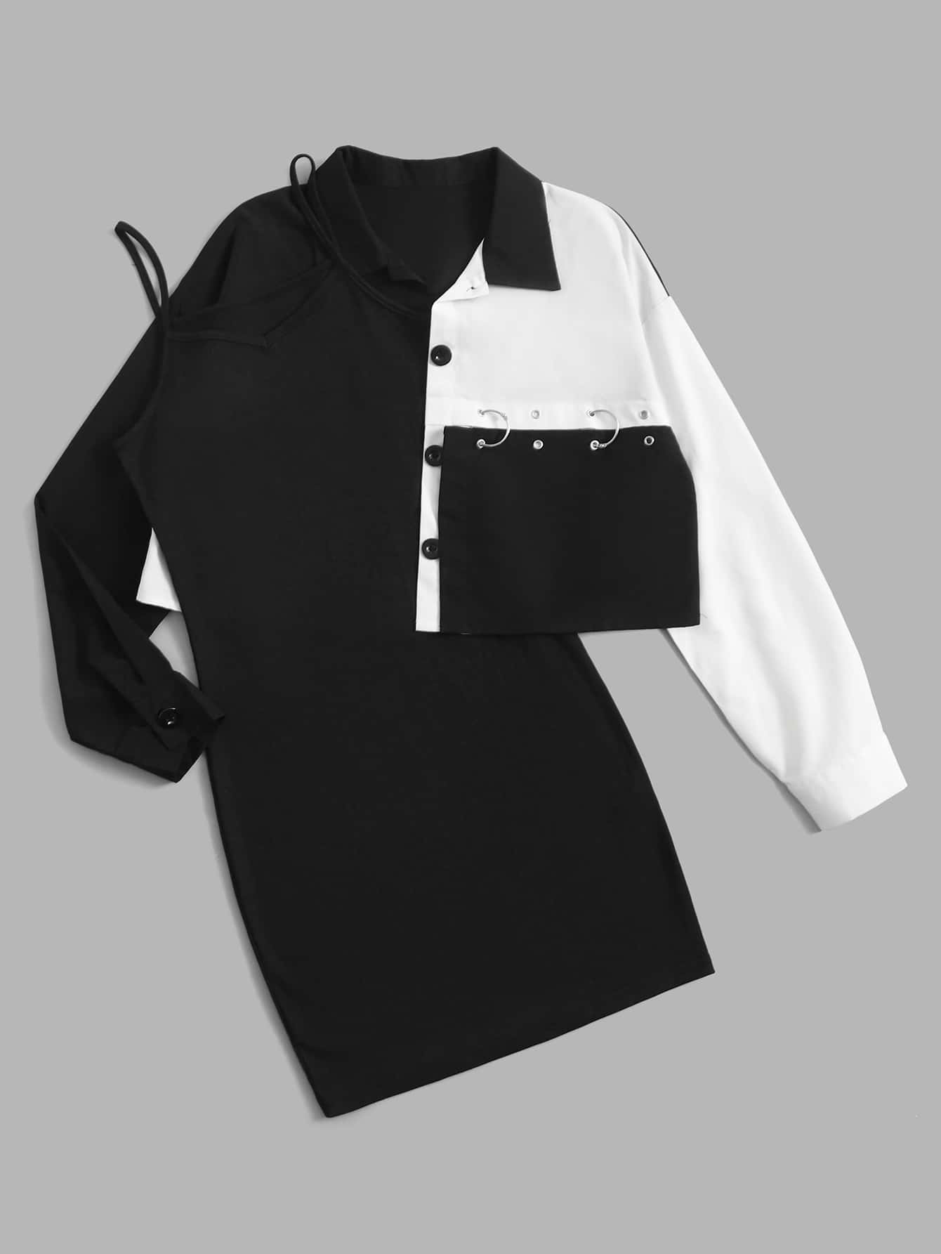 de color combinado con botón delantero con diseño de aro Blusa & unicolor Vestido de tirantes