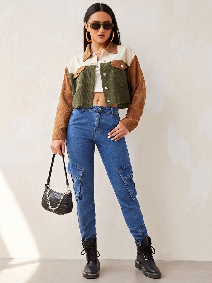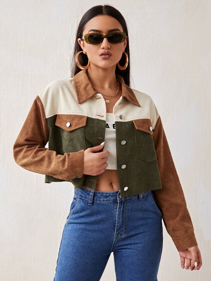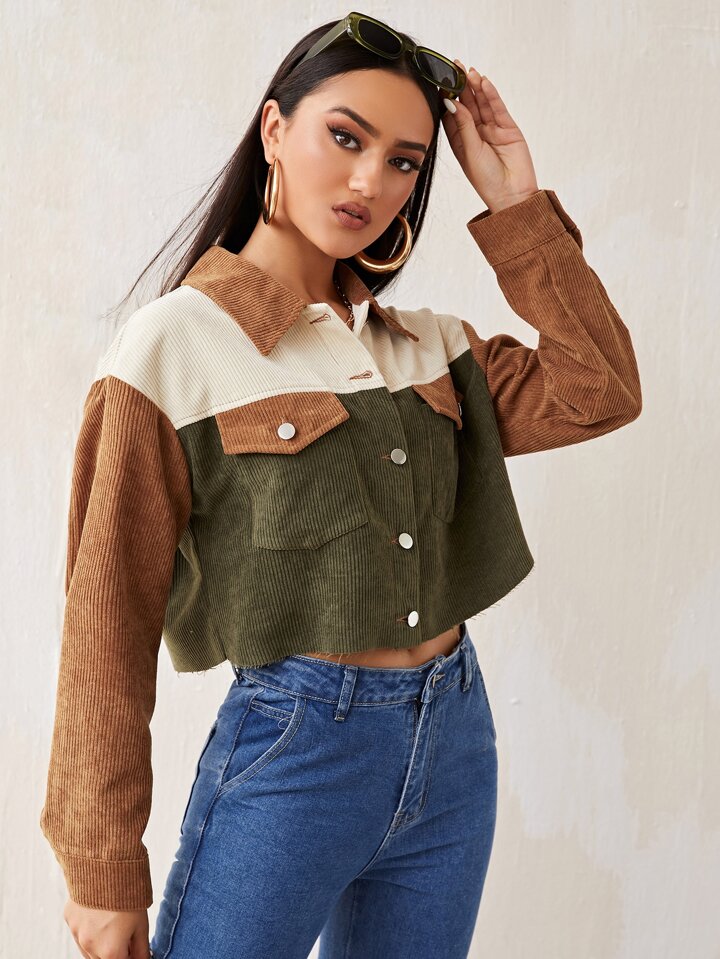 Cazadora de color combinado con bolsillo con solapa de hombros caídos con botón delantero de pana