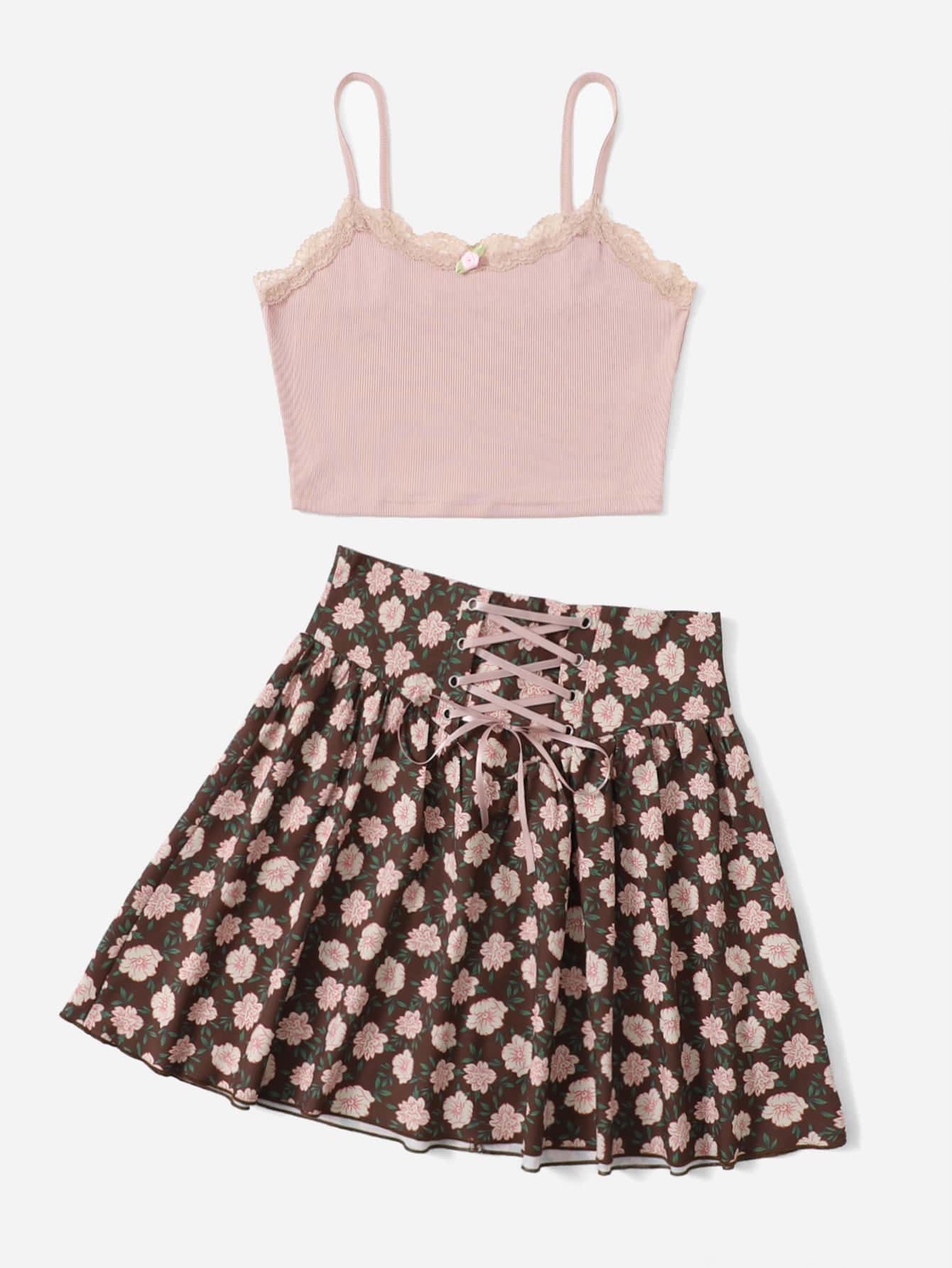 Top de tirantes con encaje en contraste & Falda con estampado floral