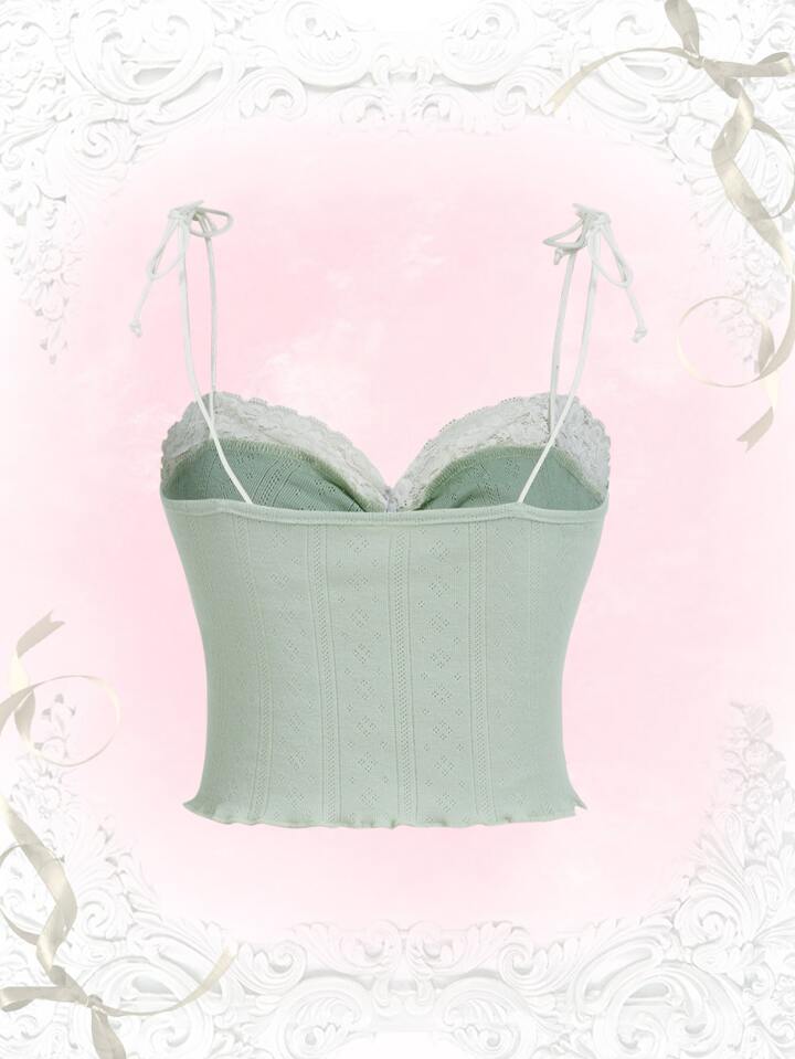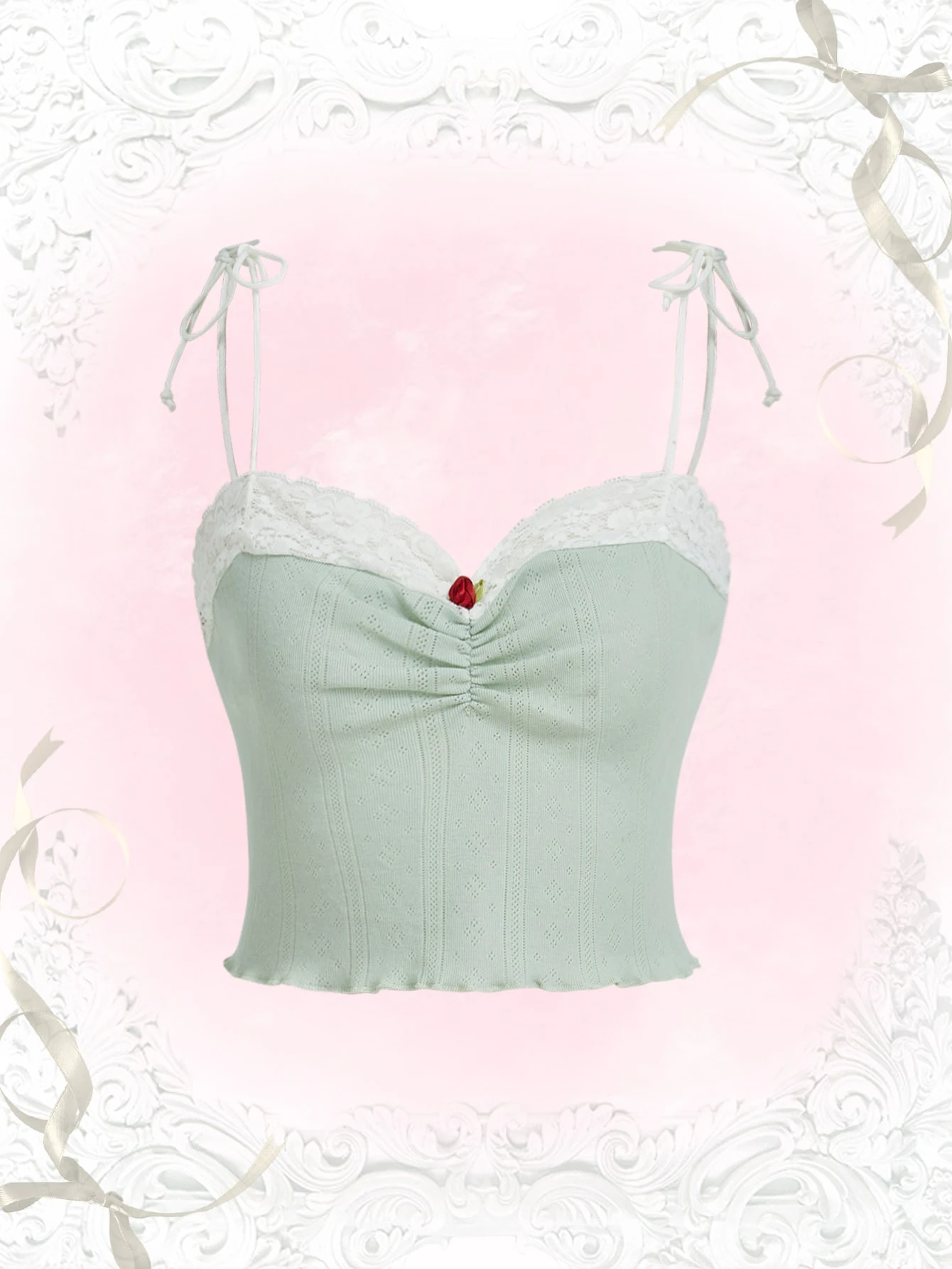 Top de tirantes con encaje en contraste fruncido de hombros con cordón