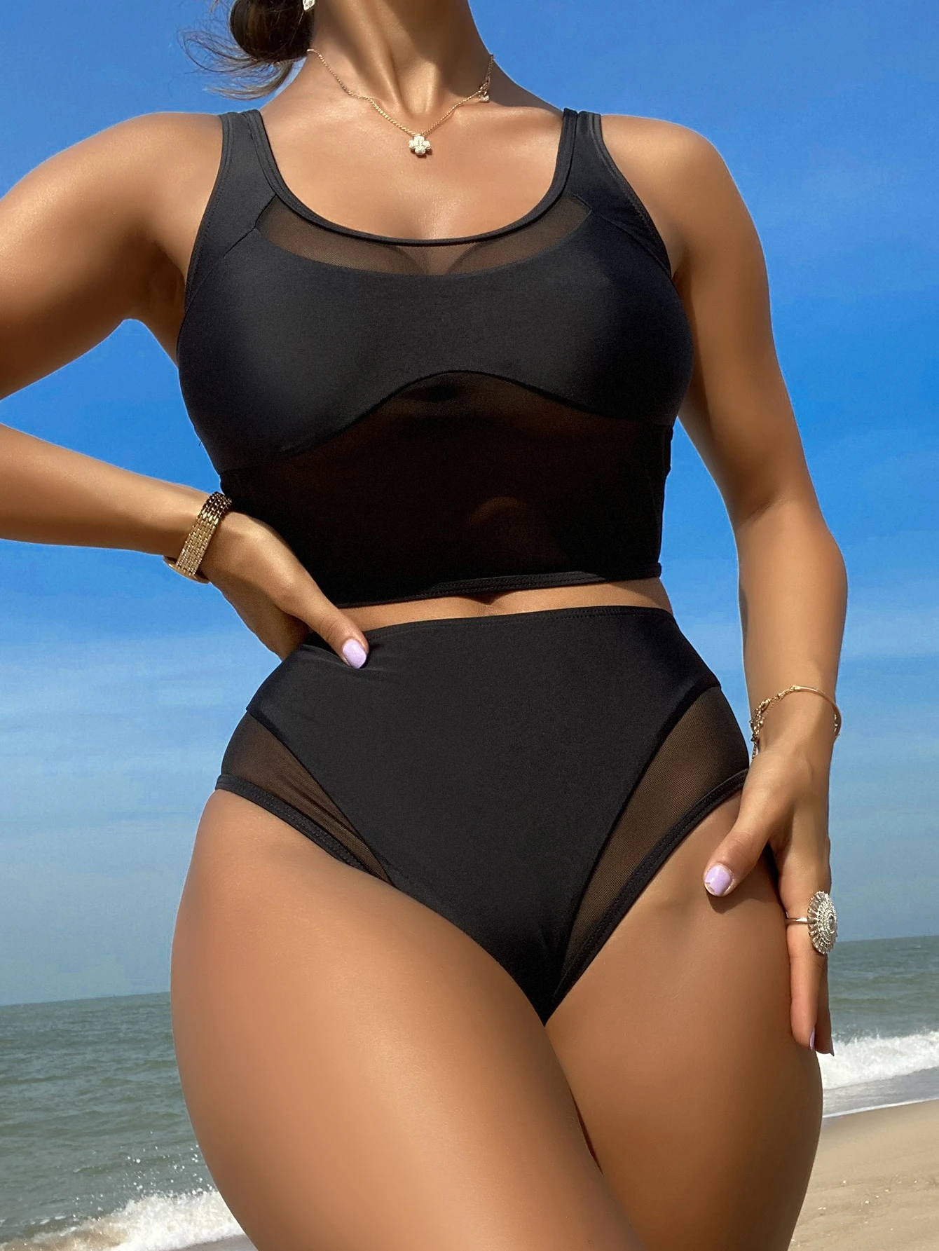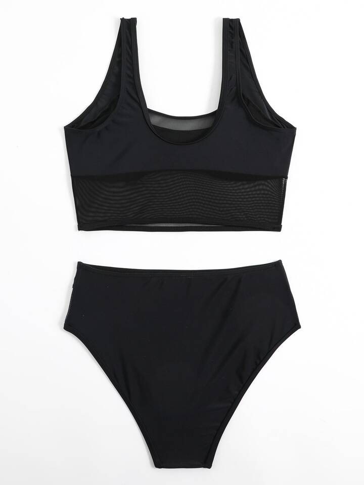 Conjunto de bikini de cintura alta con malla de contraste para playa de verano