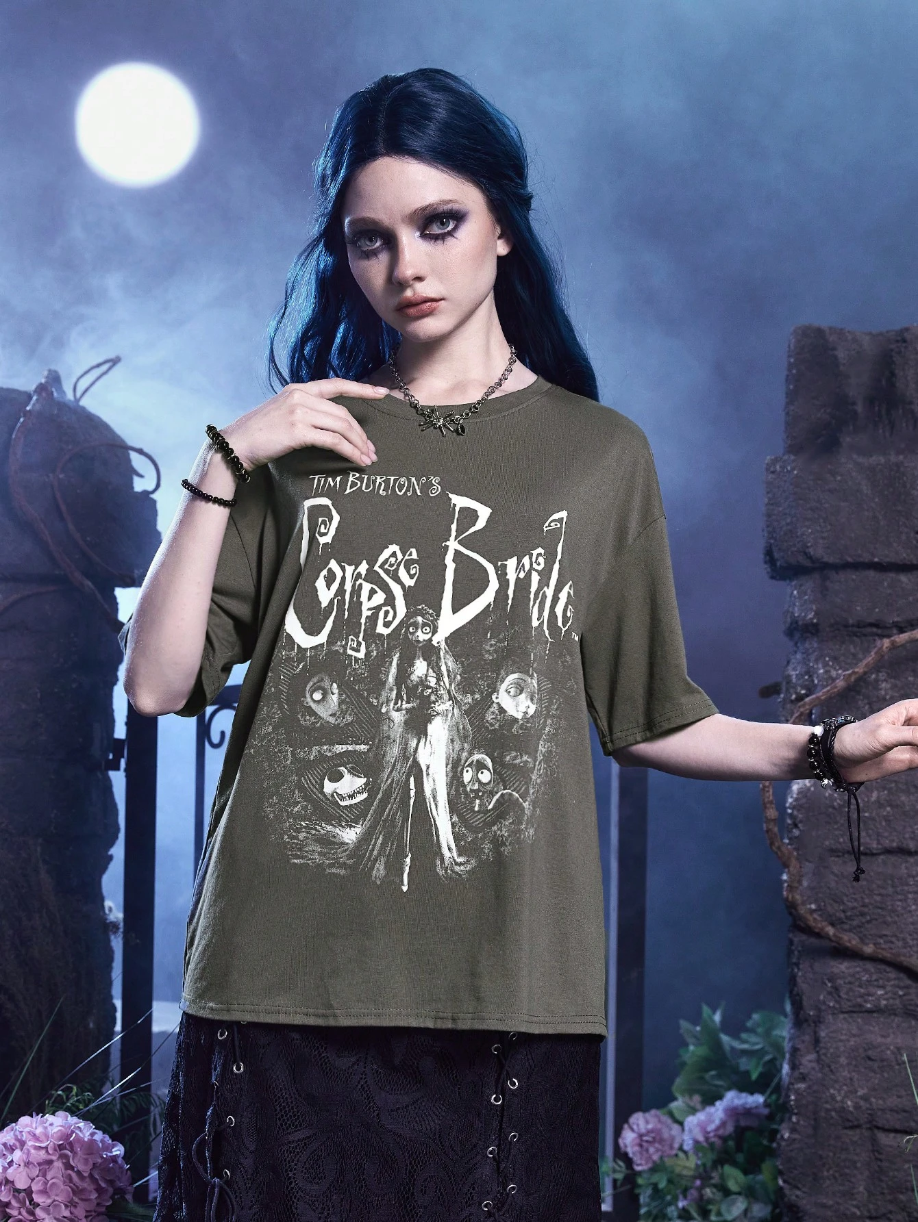 Corpse Bride | ROMWE Camiseta De Cuello Redondo De Hombros Caídos Y Talla Grande Con Estampado De Caricaturas