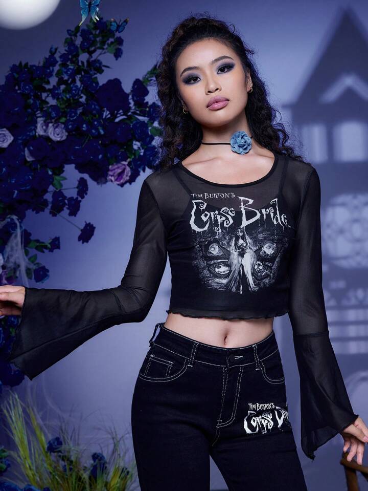 Corpse Bride | ROMWE Top con letra con estampado de cráneo crop de malla