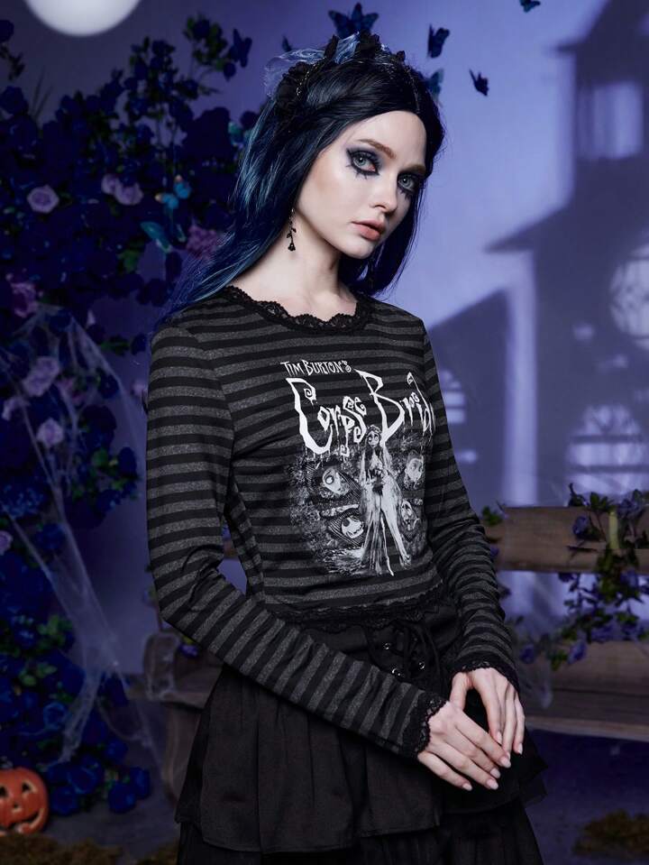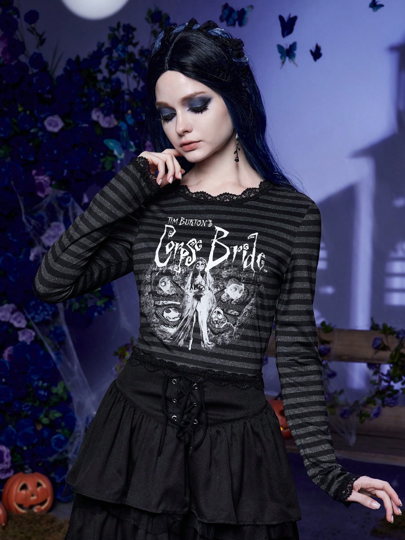Corpse Bride | ROMWE Camiseta con estampado de rayas y letra ribete con encaje en contraste
