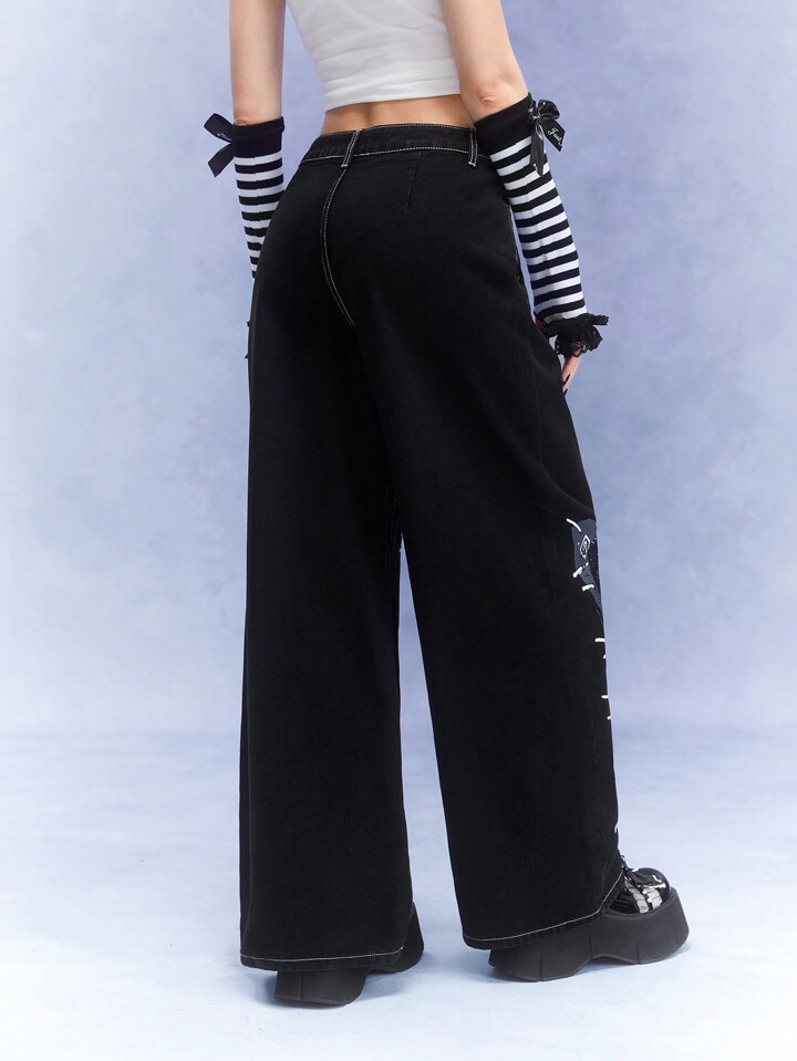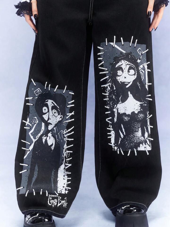 Corpse Bride | ROMWE Pantalones vaqueros de pierna ancha tipo boyfriend con estampado de dibujos animados y costuras de contraste, sin cinturón, para la escuela
