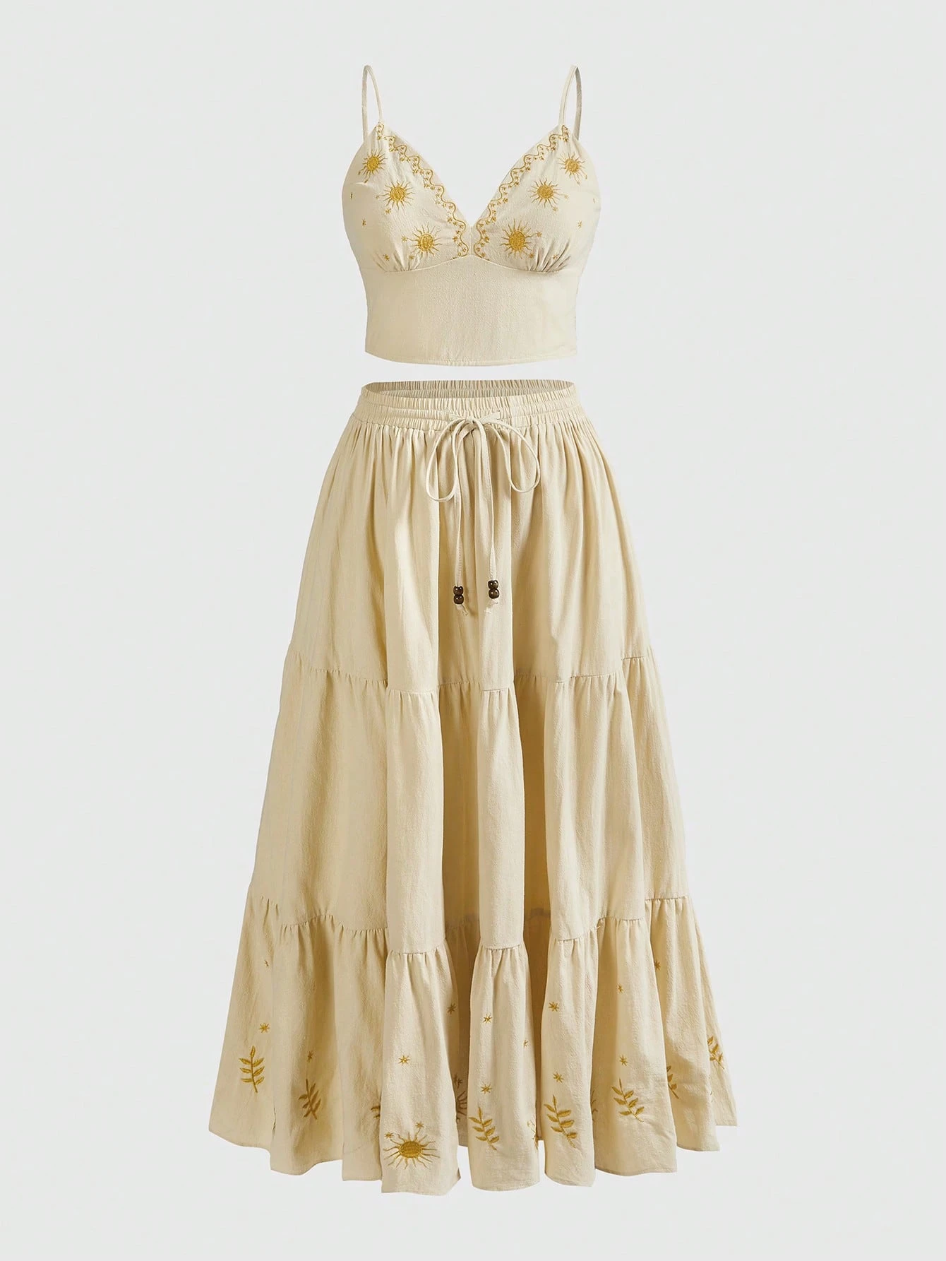 Conjunto de 2 piezas de talla grande con top de tirantes bordado con sol, luna y estrellas en estilo vintage campestre hippie y falda larga maxi