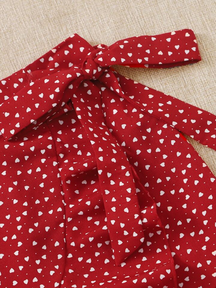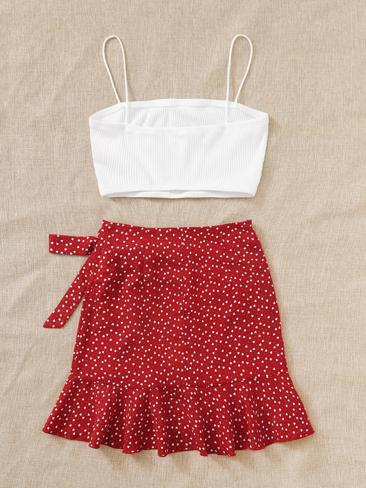Conjunto top de tirante corto con falda con cordón lateral cruzado ribete fruncido con estampado de corazón