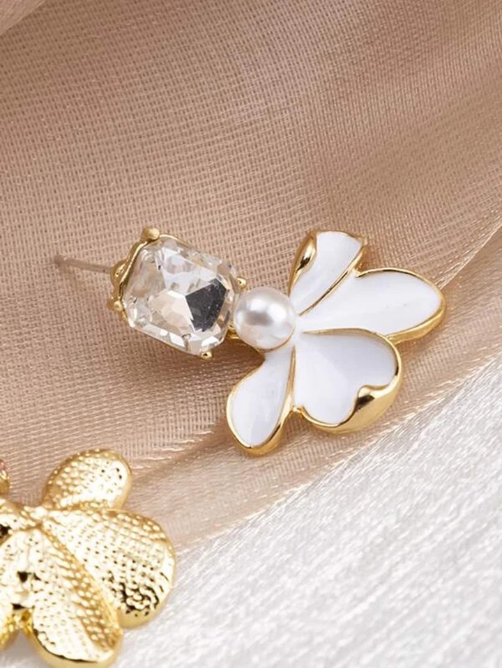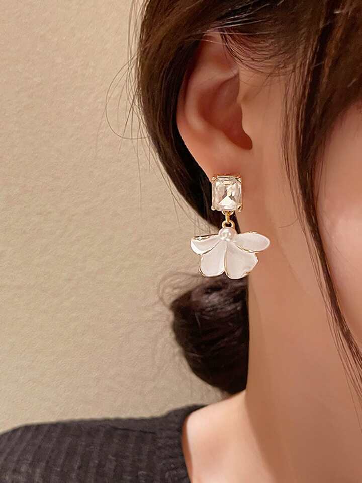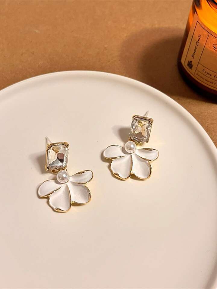 Pendientes largos zirconia cúbica & con diseño de perla artificial flor
