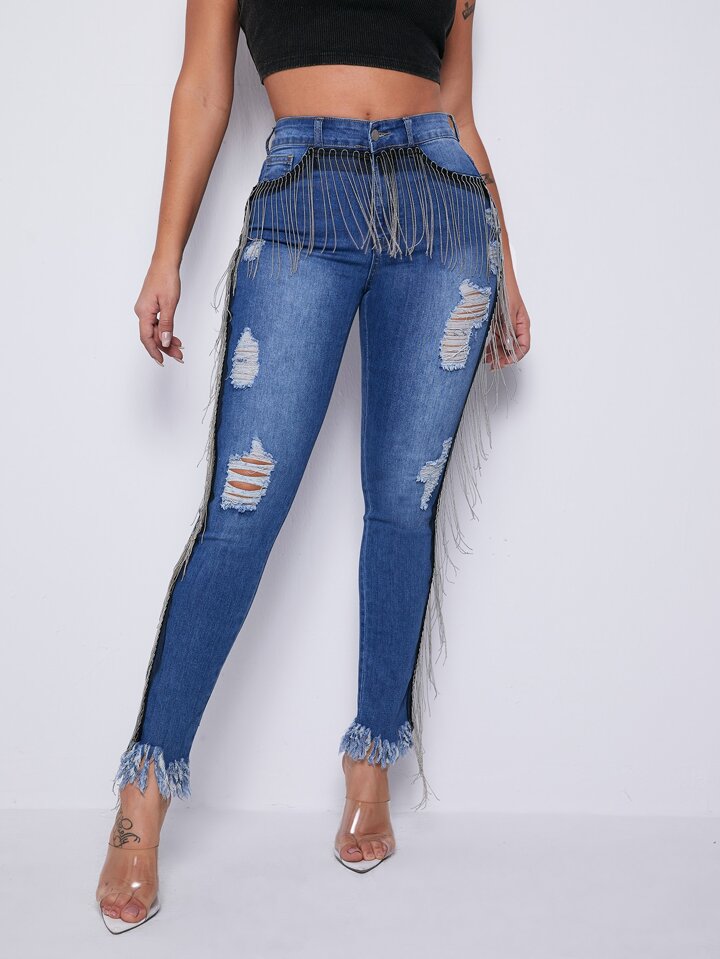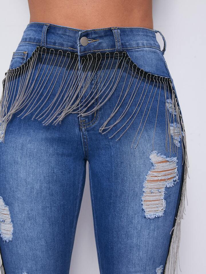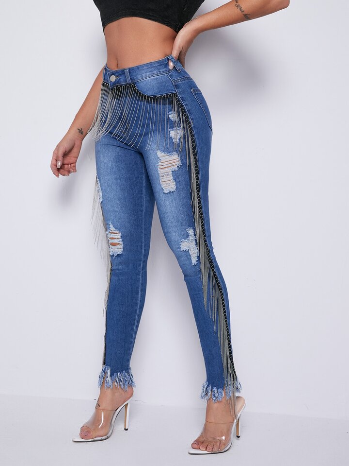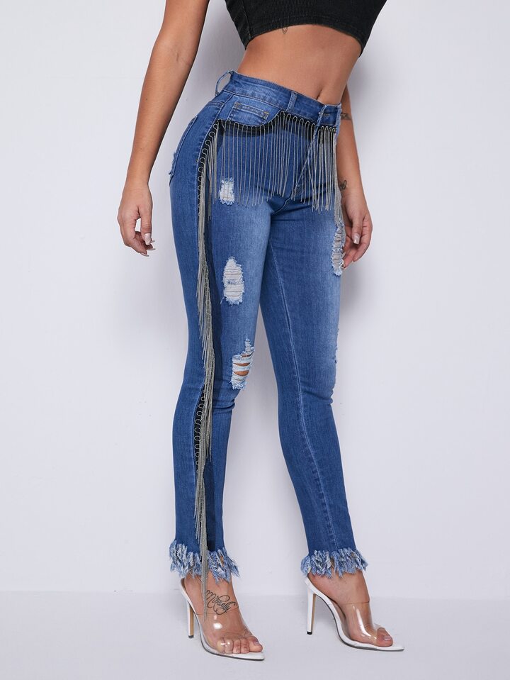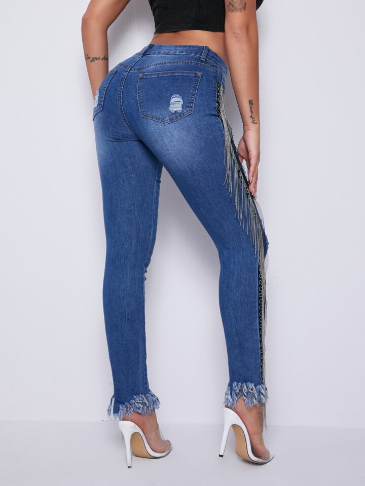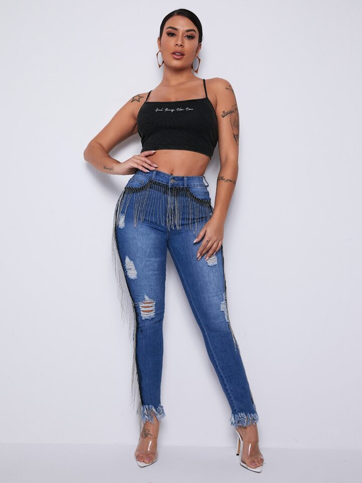 Jeans curvos ajustados rotos con fleco bajo crudo de cintura alta