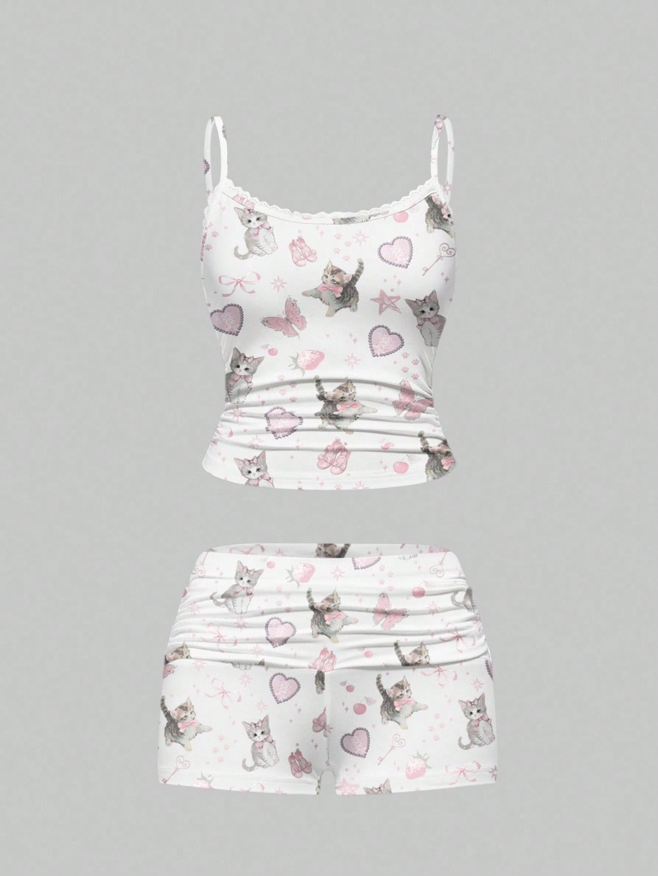 Conjunto de ropa de estar en casa con camiseta de encaje con estampado completo y shorts fruncidos con diseño lindo y kawaii de gatito con moño