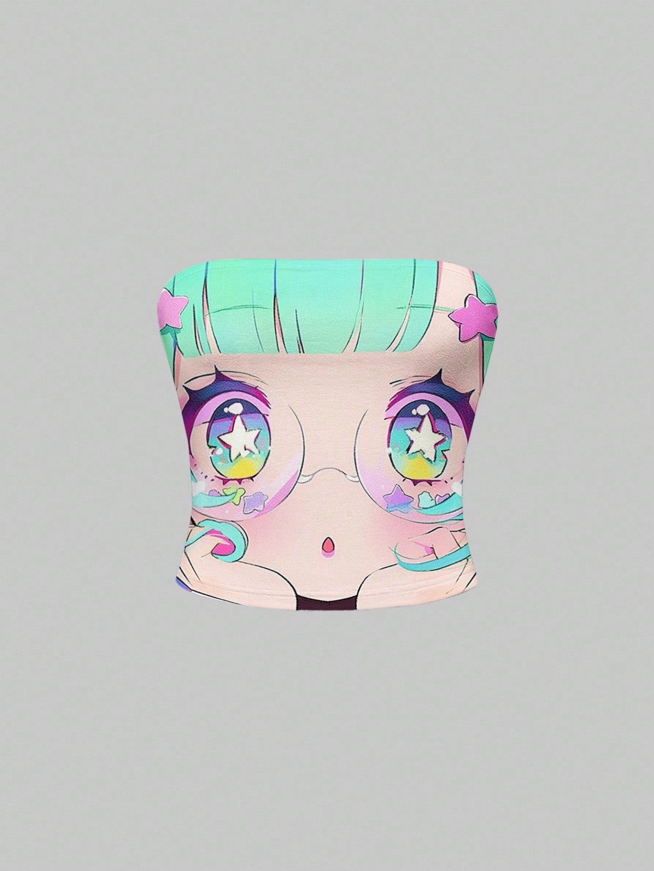Anime Top corto sin mangas con gráfico de ojos grandes y caras kawaii de color verde y rosa, estilo subcultura Y2K para mujeres