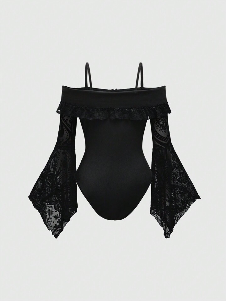Goth Body gótico oscuro con hombros descubiertos, bajo asimétrico, mangas acampanadas con estampado flockado y diseño cruzado de metal para mujer, para el verano y la playa