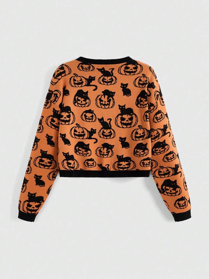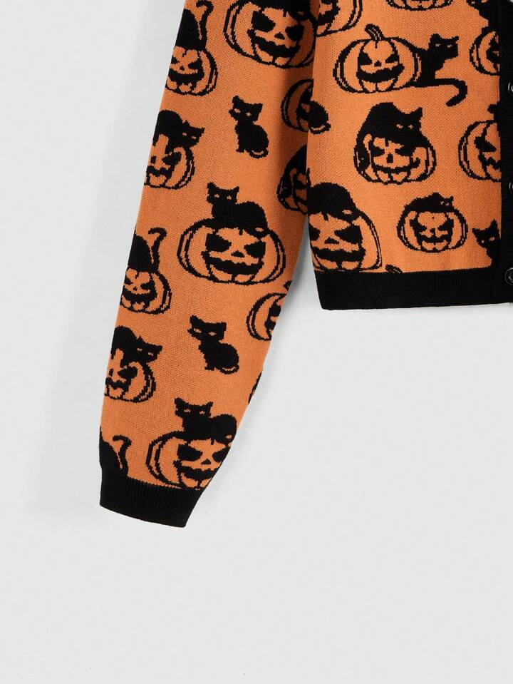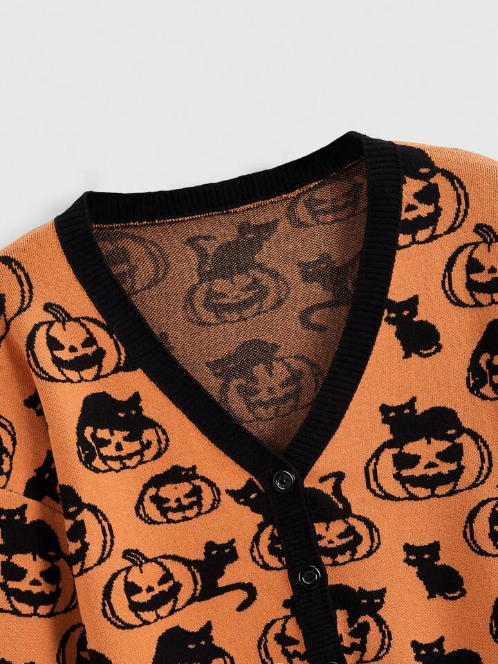 Cárdigan de punto jacquard con calabaza y gato de Halloween oscuro