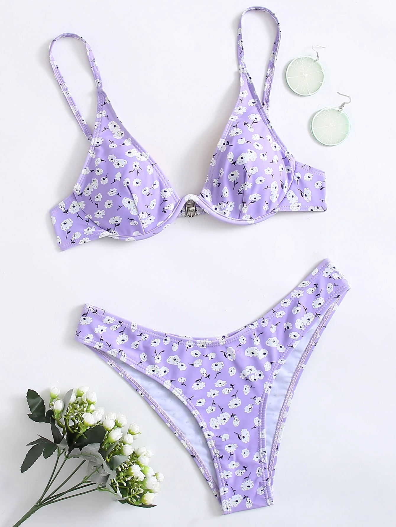 Conjunto de bikini recortado floral diminuto de corte alto para playa de verano