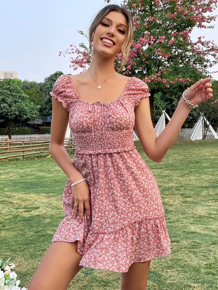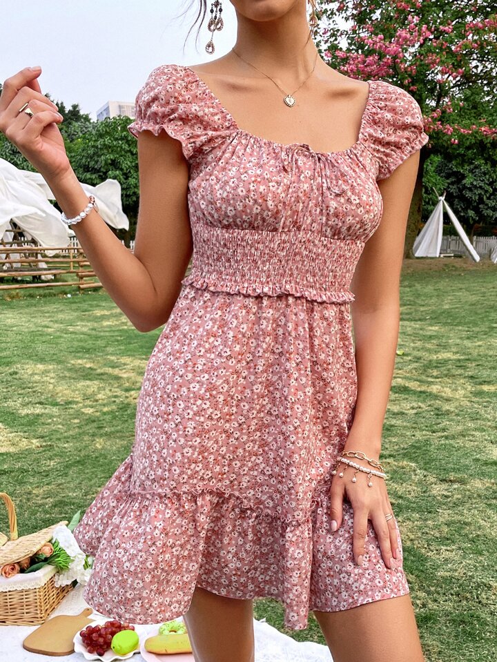Vestido floral con nudo pecho con fruncido de cintura fruncido
