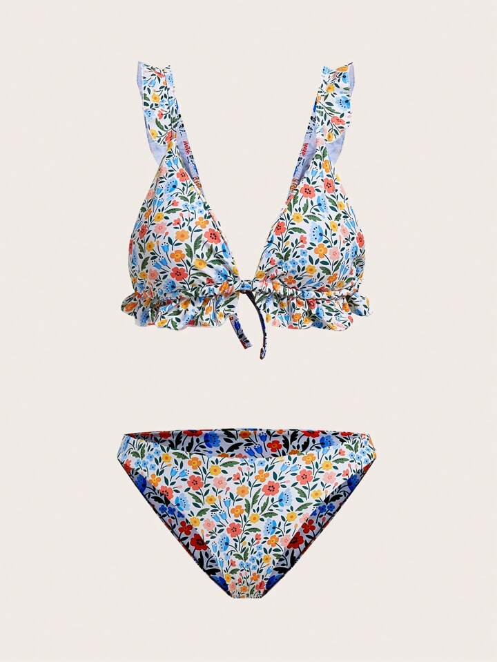 Conjunto de bikini de playa de verano con estampado floral pequeño y ribete de volantes