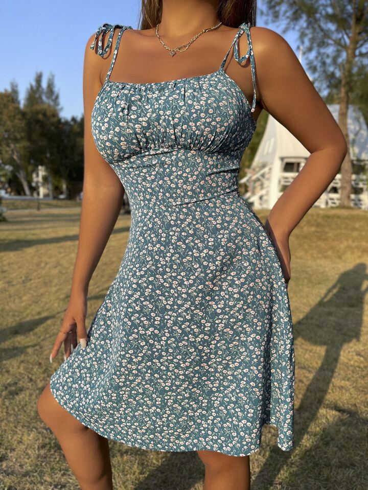 Vestido de tiras con busto fruncido con estampado floral para vacaciones y playa para mujeres