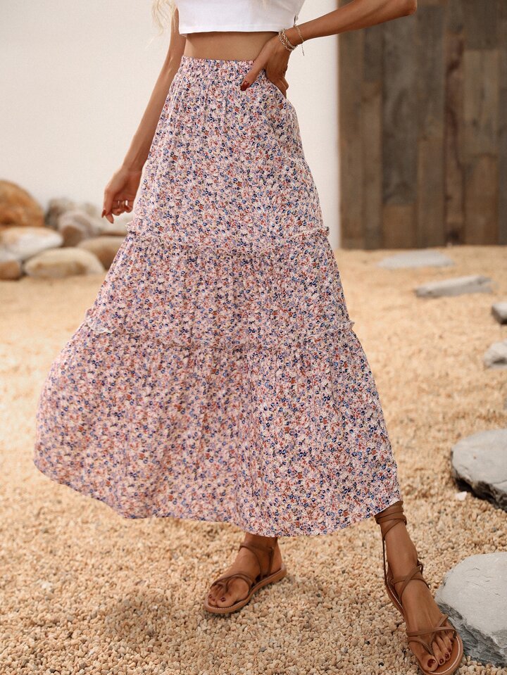 Falda larga con volantes con estampado floral pequeño, conjunto de vacaciones y playa para mujeres