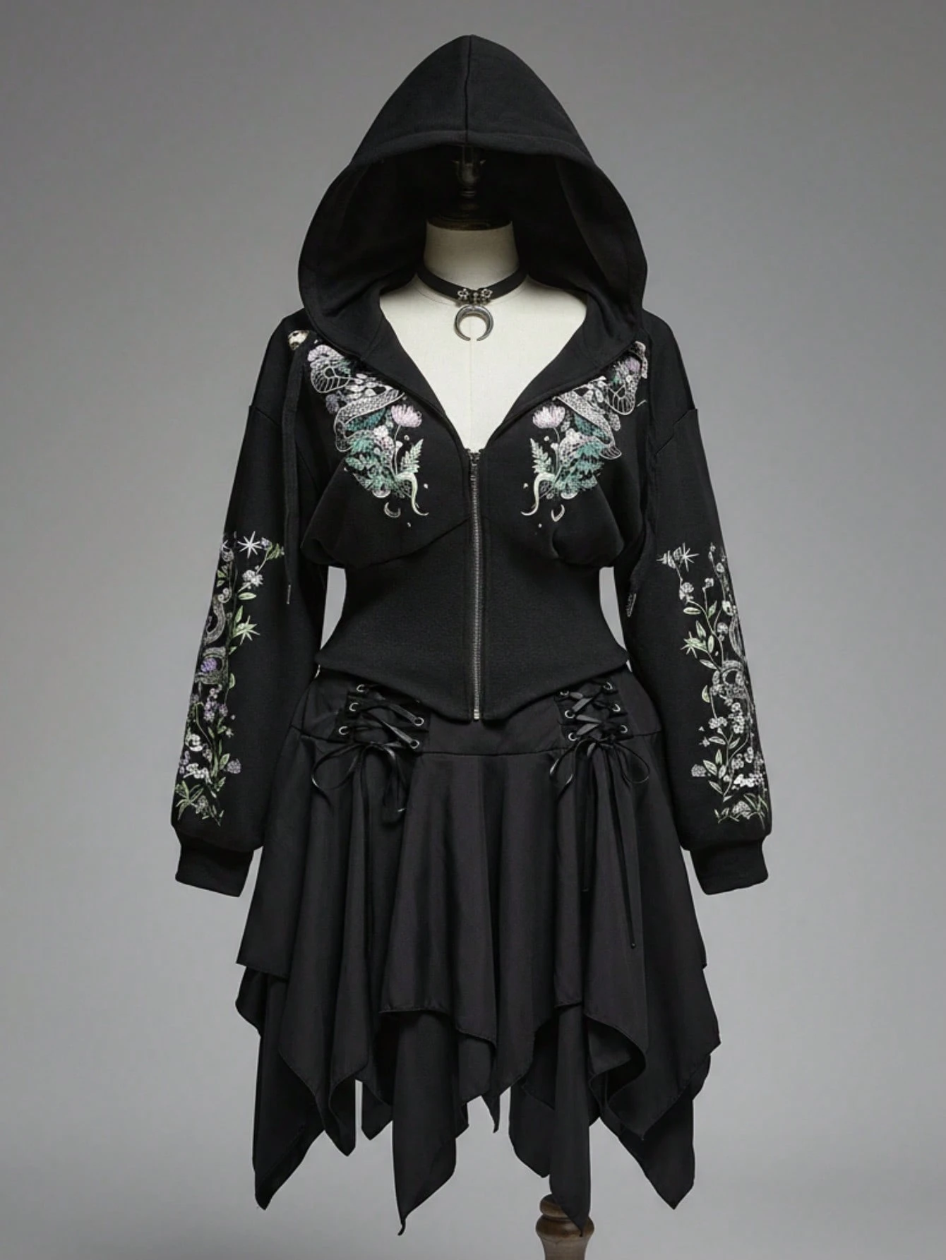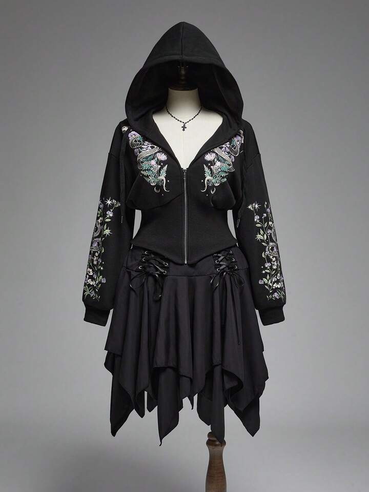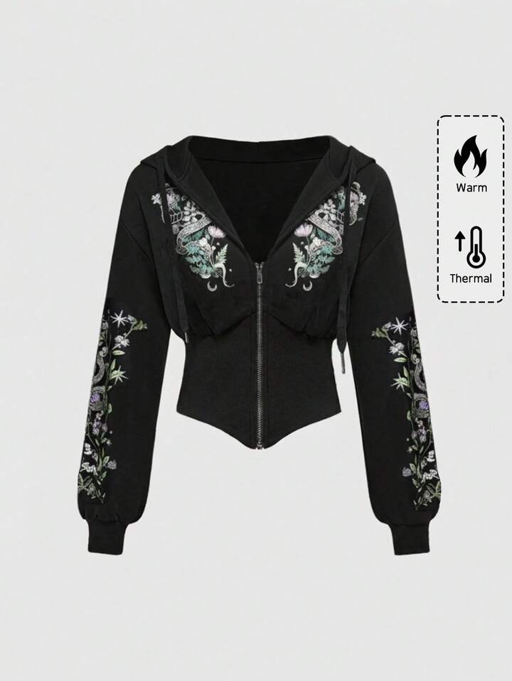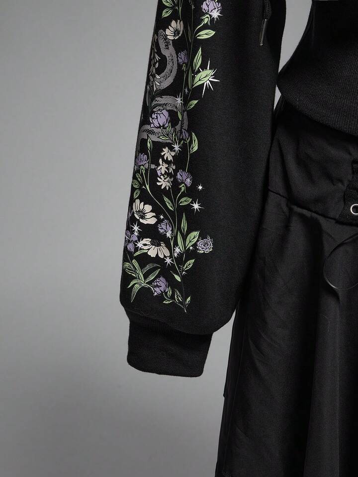 EDITION Sudadera con capucha de talle alto de talla grande con estampado de flor de serpiente de selva espinosa de luna oscura gótica en color morado, sudadera de talle alto con capucha de talla grande para otoño/invierno, parte superior de exteriores de talla grande para mujer en otoño/invierno