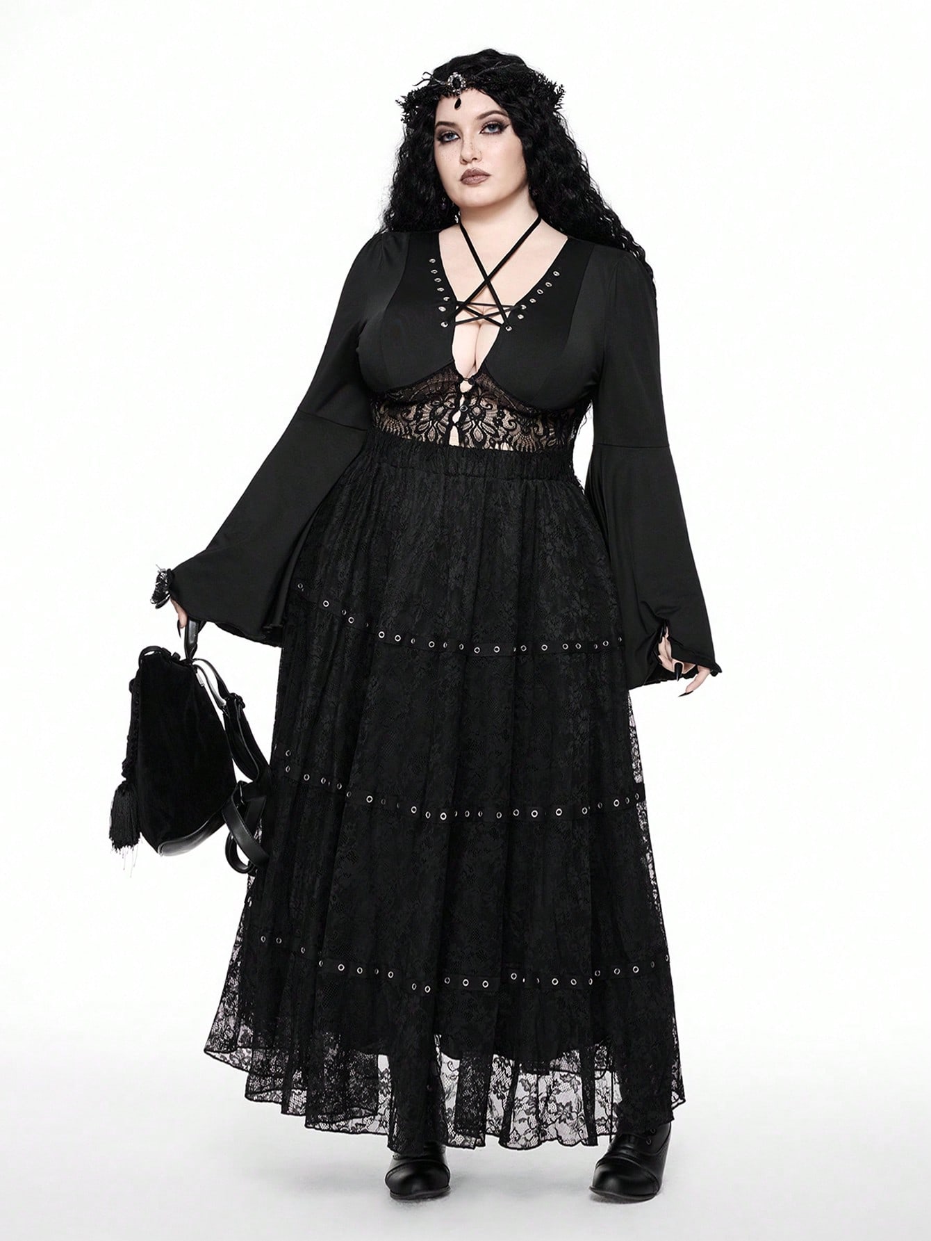 EDITION Blusa de encaje con mangas de campana, cuello con lazo y parche con diseño de pentágono, estilo gótico elegante y vintage para tallas grandes. Moda gótica de otoño/invierno para damas, sexy, de manga larga, color negro