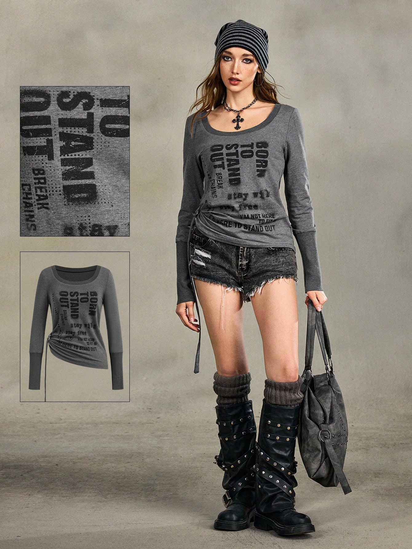 EDITION Camiseta de manga larga con detalle de volantes y anillo, estampado floral y eslogan, estilo gótico vintage desgastado, casual para mujer, primavera/otoño