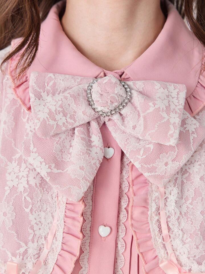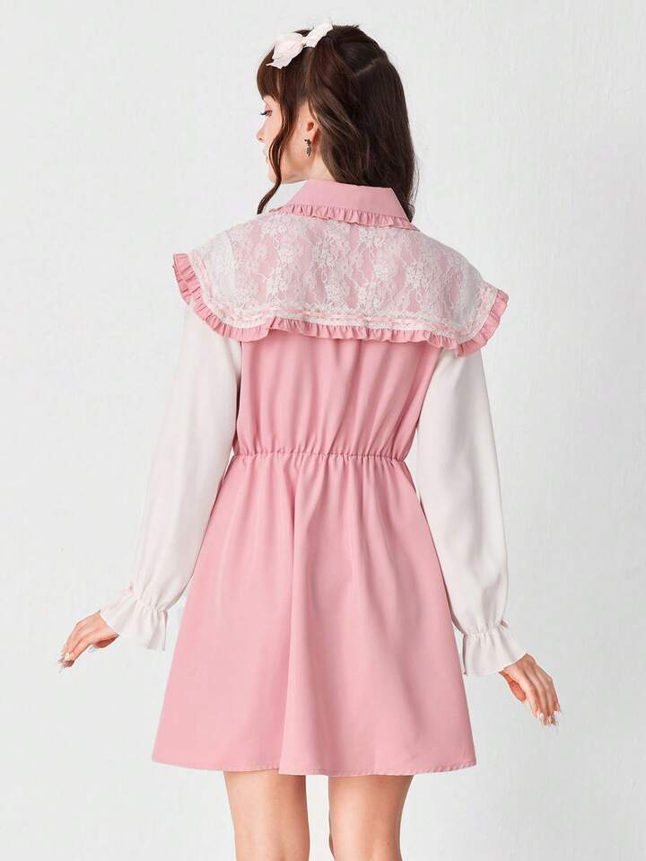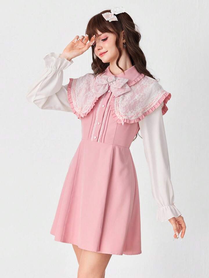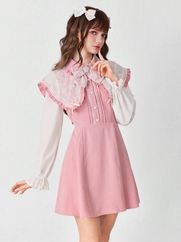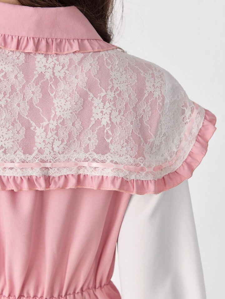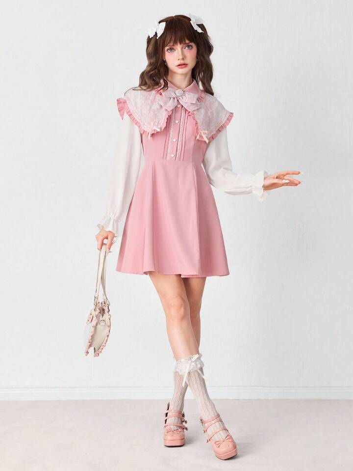 EDITION Vestido de manga larga con cuello Peter Pan, encaje y lazo en contraste de color, estilo princesa lindo para mujer