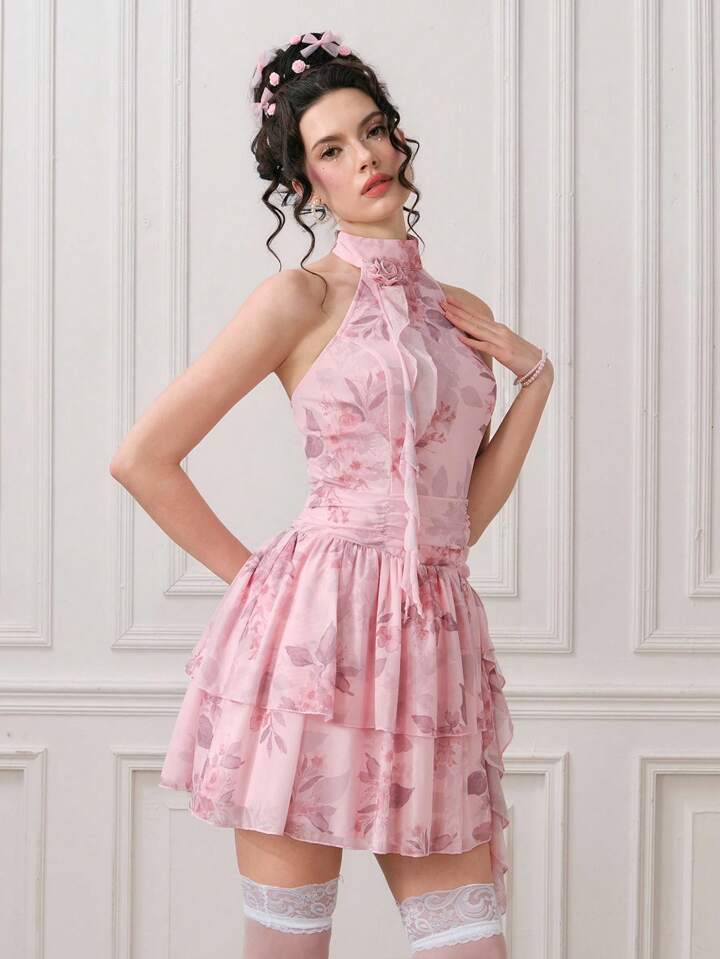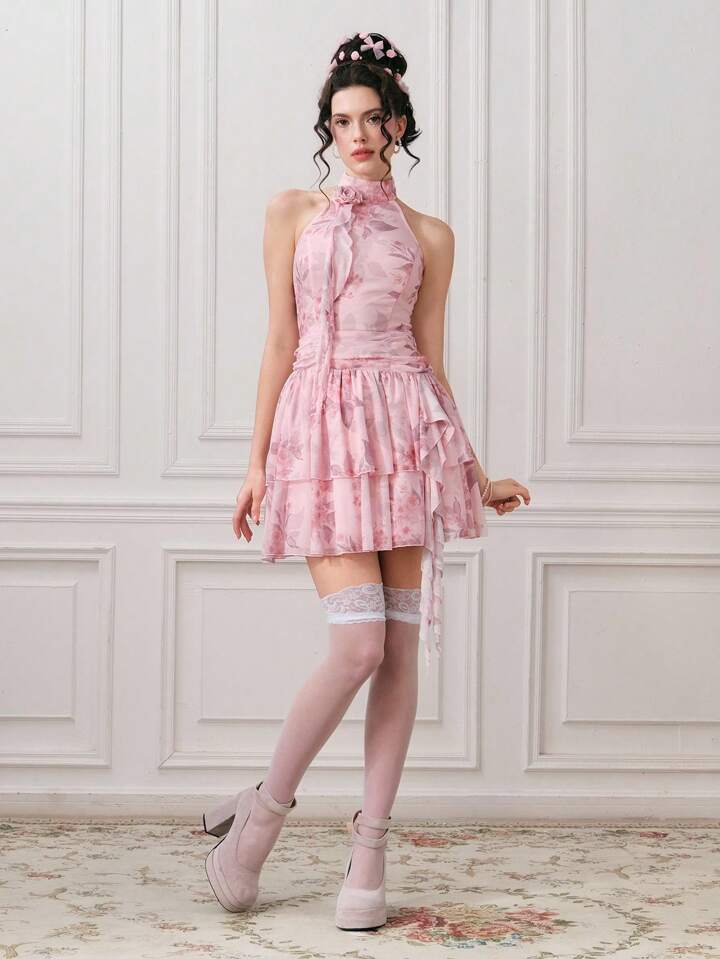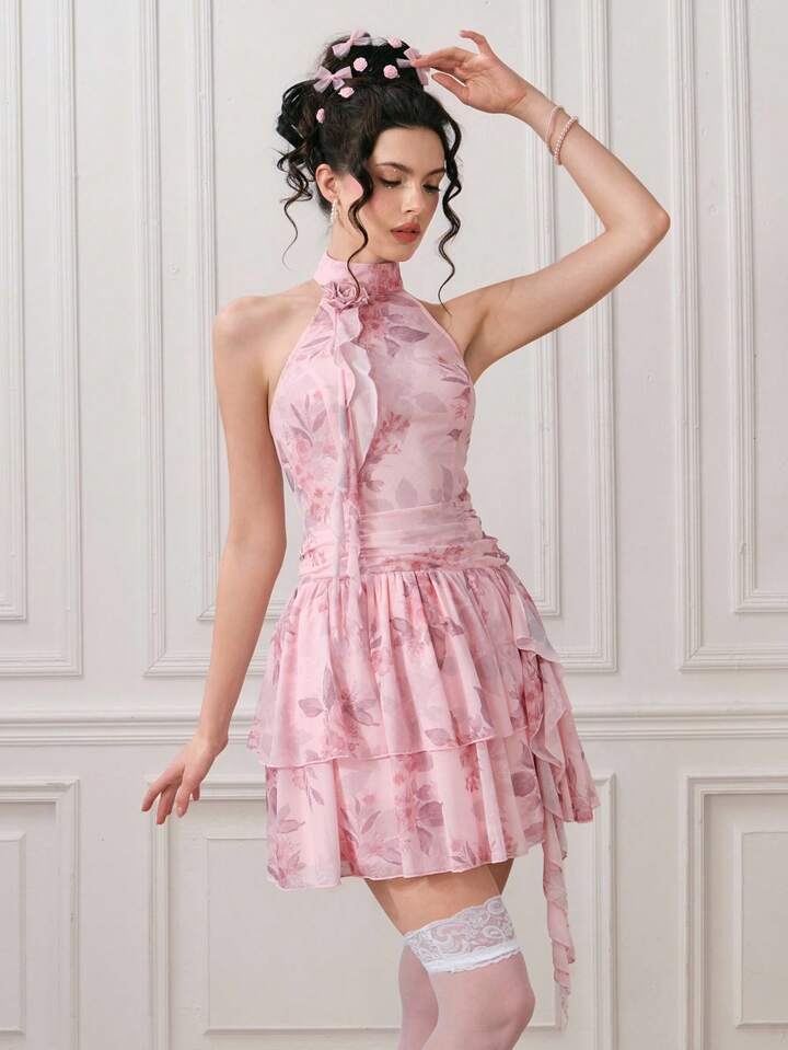EDITION Vestido corto elegante sin mangas con estampado floral y plisados para mujer