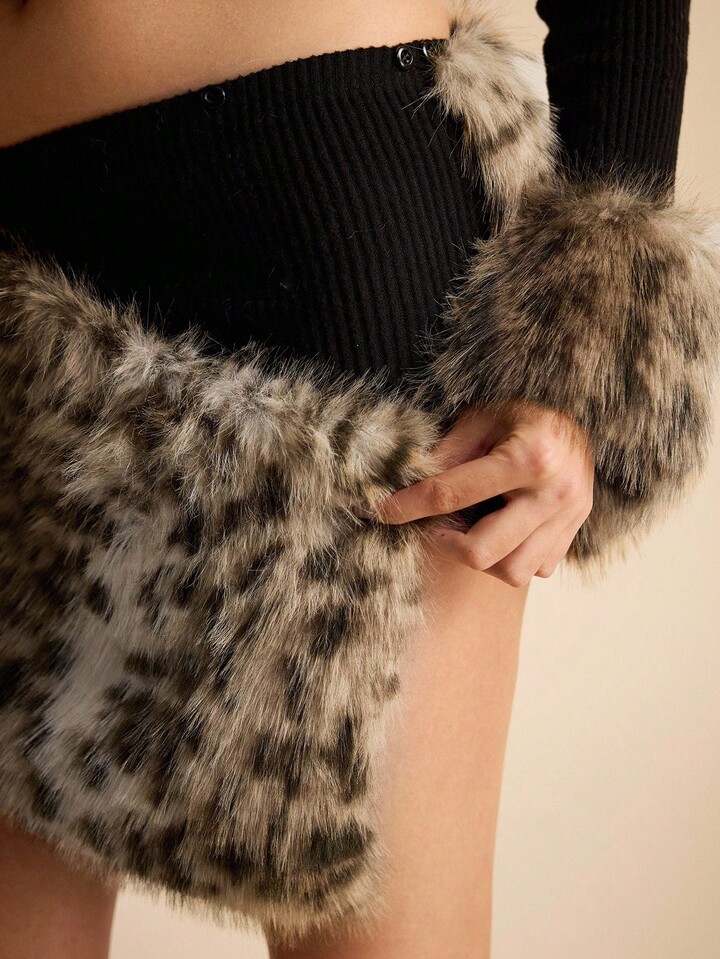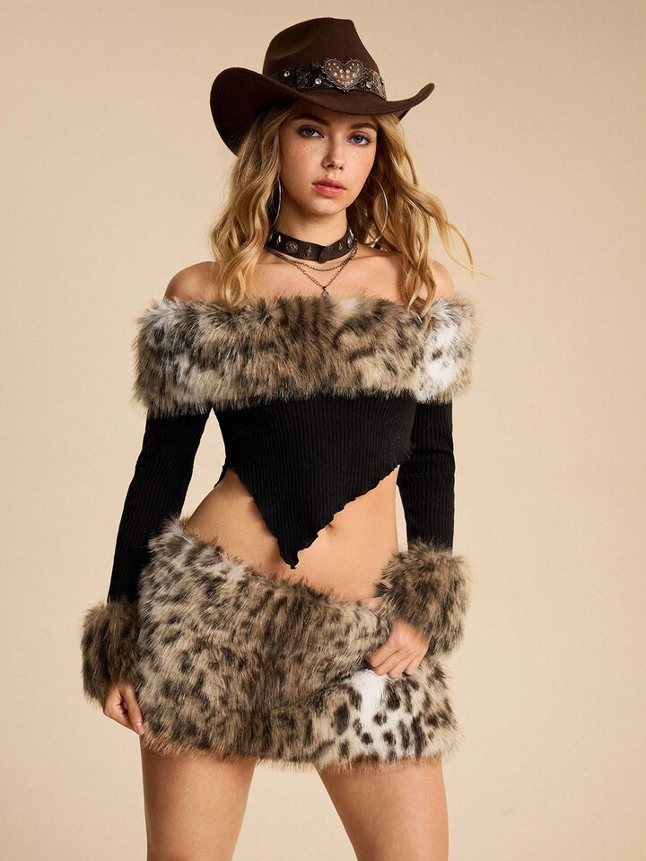 EDITION Top con cuello halter de mujer con estampado de leopardo, parches de piel y estilo Harajuku Gyaru para otoño/invierno, combinado con minifalda sexy de cintura baja con estampado de leopardo y piel