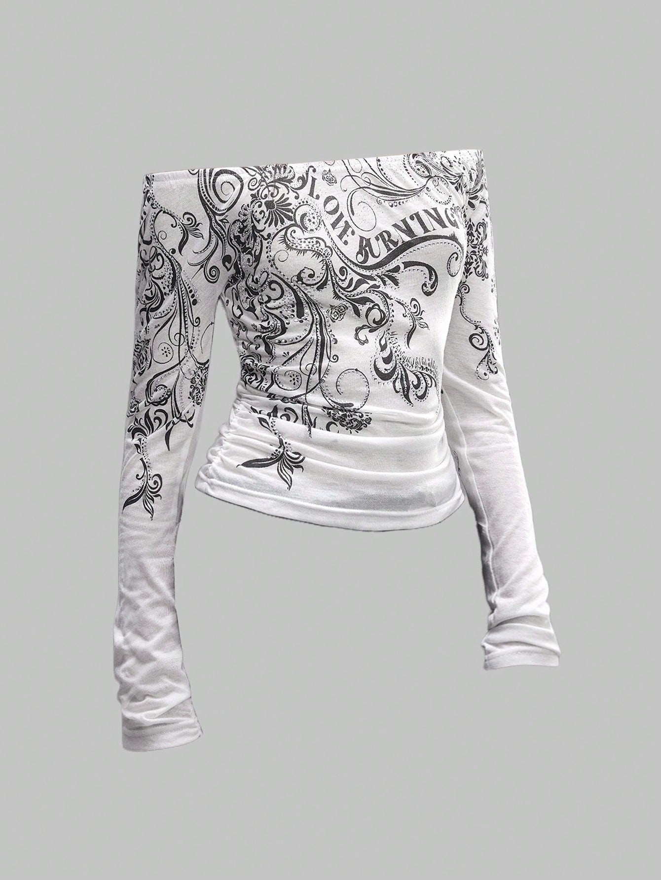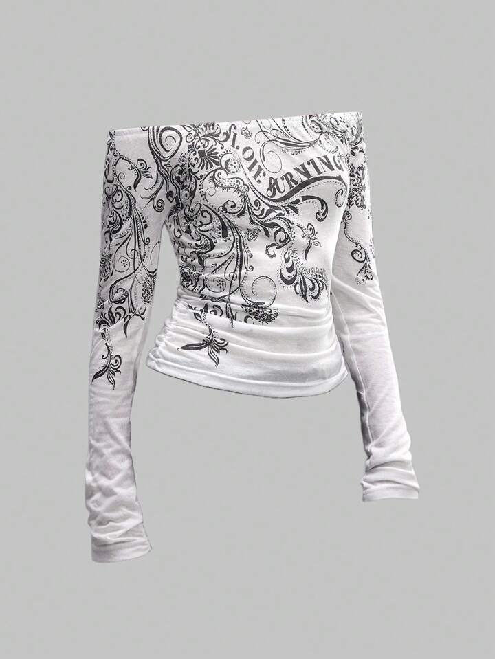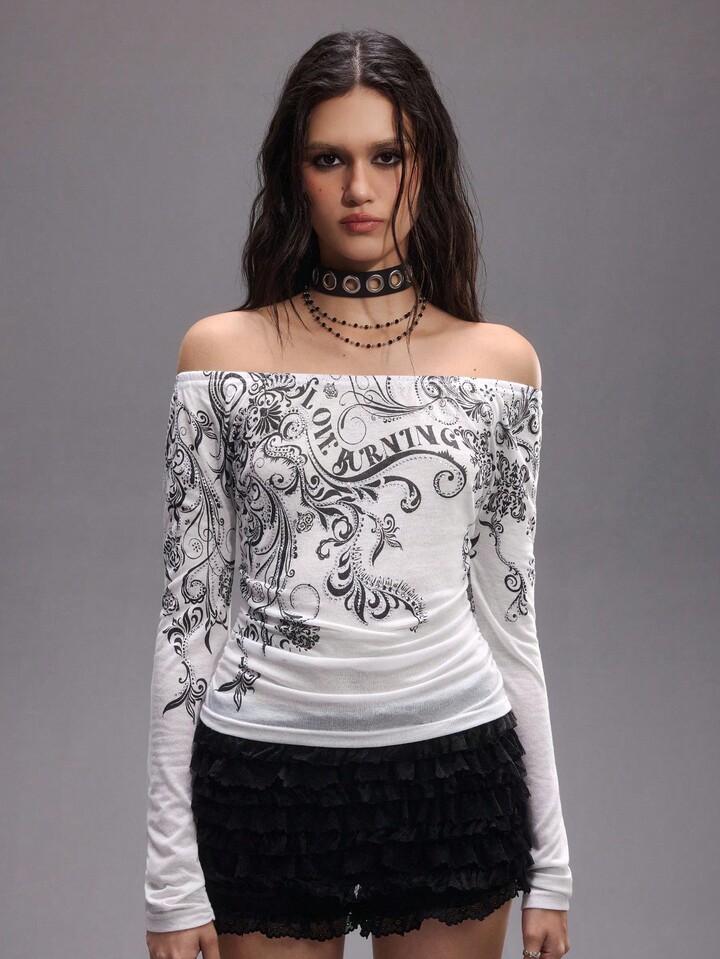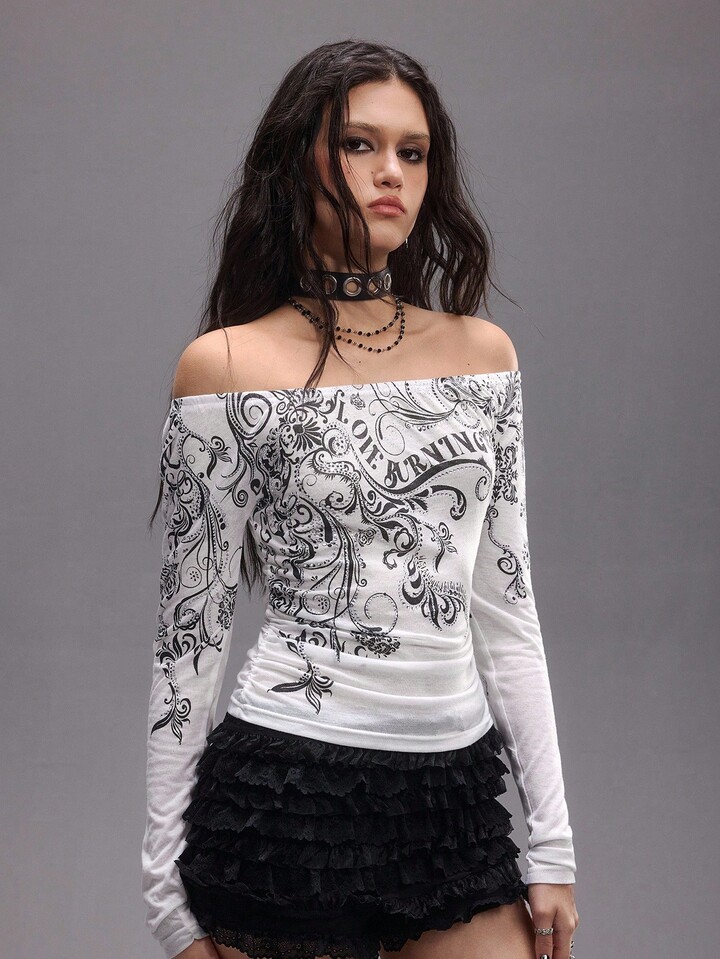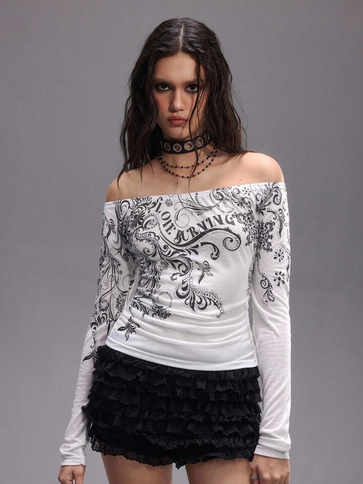 EDITION Top ajustado para mujer con estampado de enredadera y hombros descubiertos, estilo romántico punk Y2K