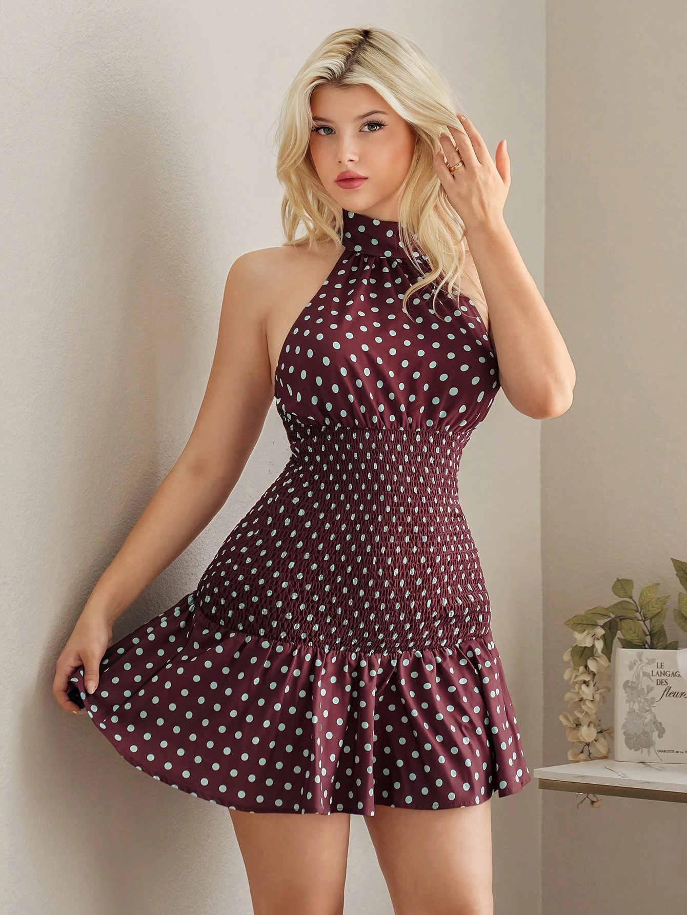 Elegante vestido mini con escote halter y estampado de lunares, para el Día de San Valentín