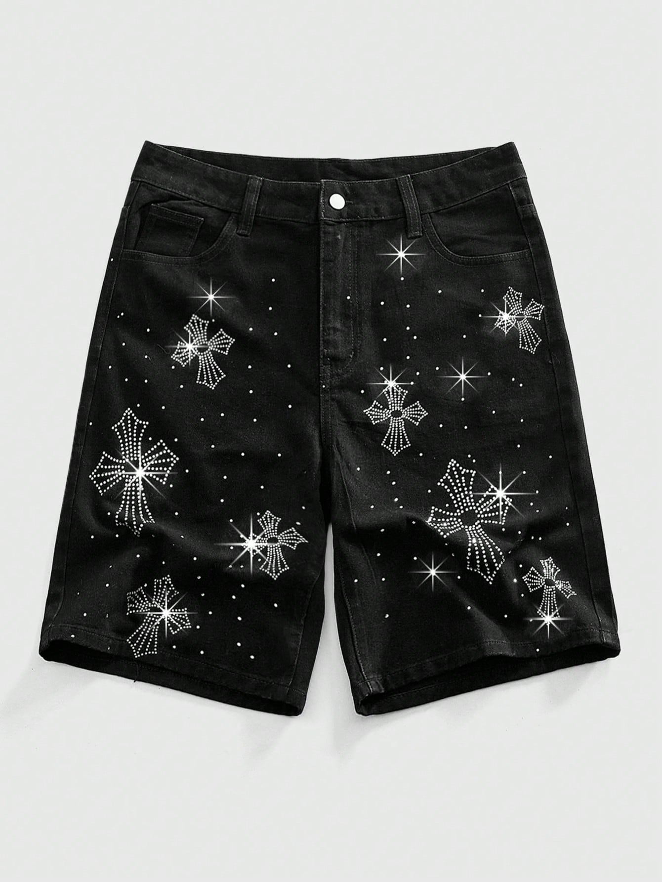 Shorts vaqueros con aplicaciones de cruz y tachuelas, estilo oscuro de streetwear