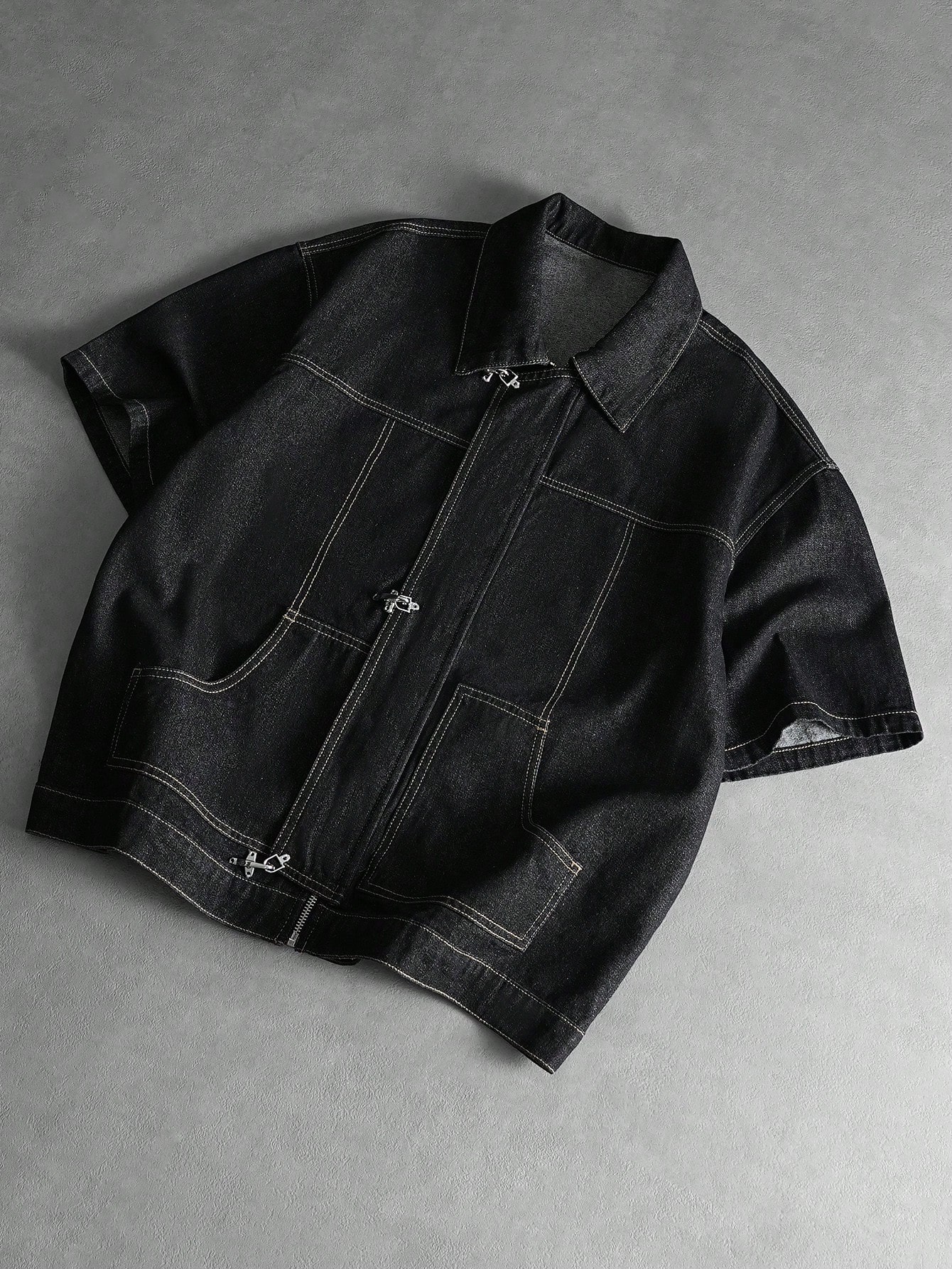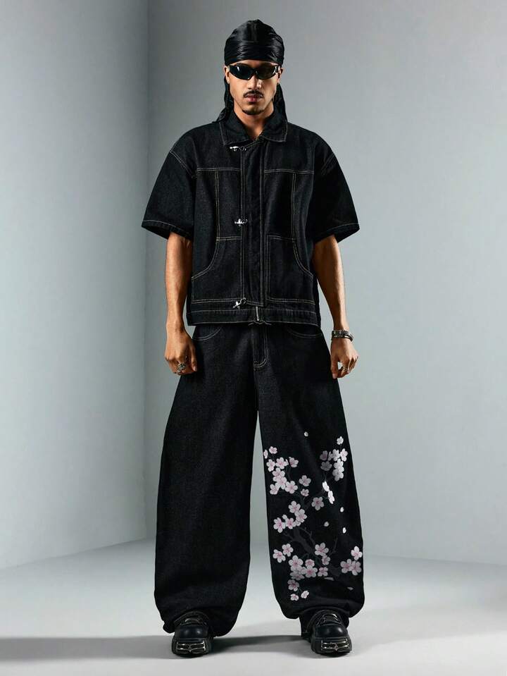 Essentials Camisa vaquera de manga corta casual y versátil con botones delanteros de unicolor para hombres