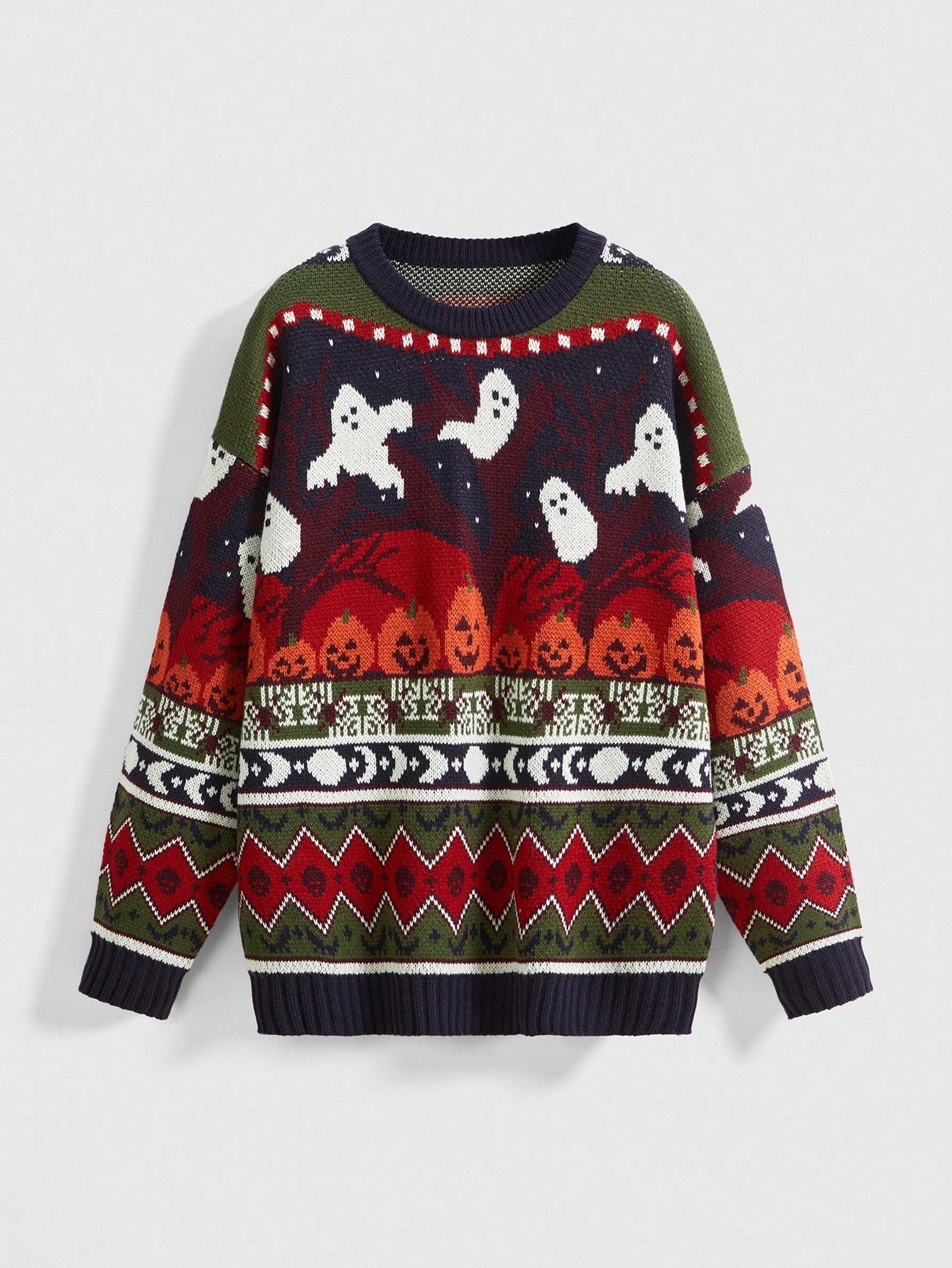 Jersey de cuello redondo con estampado Fair Isle, multicolor, adecuado para otoño/invierno y Halloween