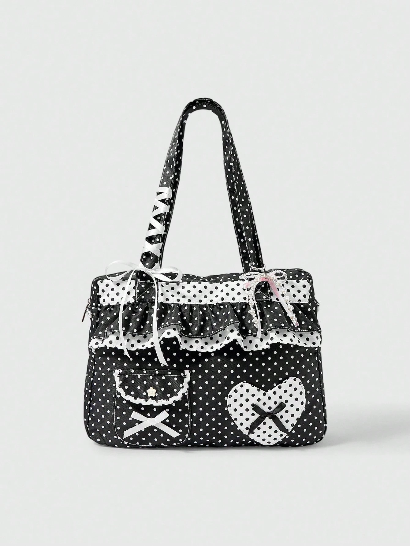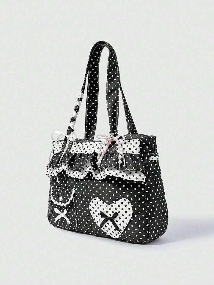 Fairycore 1 set Bolso de tote con diseño de corazón a lunares negros en patchwork, bolso de tote de mujer con estilo de lunares personalizado y fashionable (incluyendo 1 bolso y 1 set de accesorios)