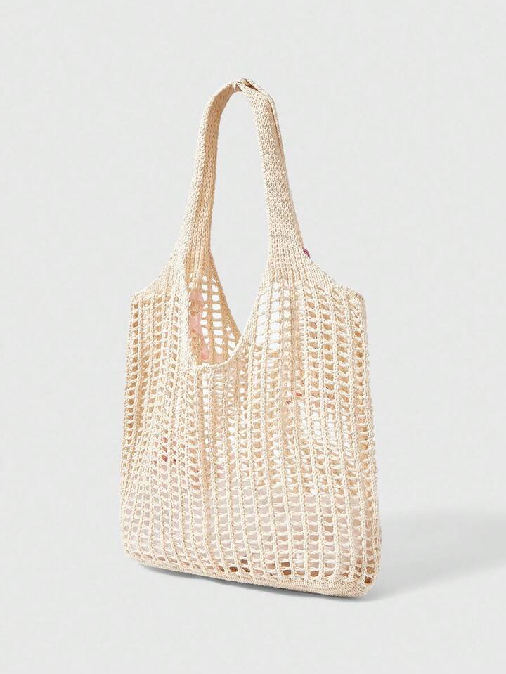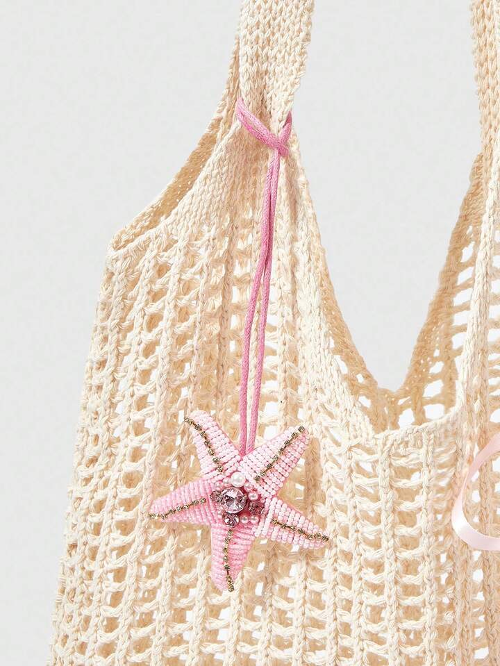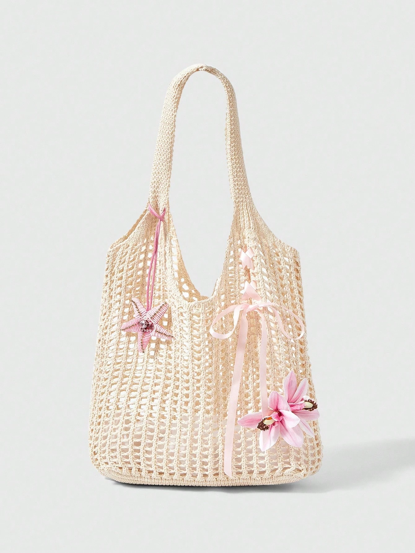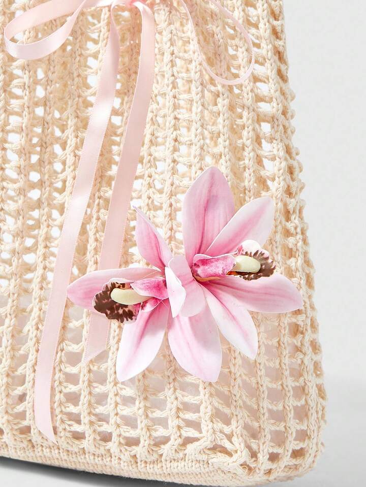 Fairycore 1 pieza Bolso de playa estilo bohemio, bolso de red calado para mujeres, adecuado para vacaciones, decorado con flores tropicales artificiales (incluye decoración DIY)