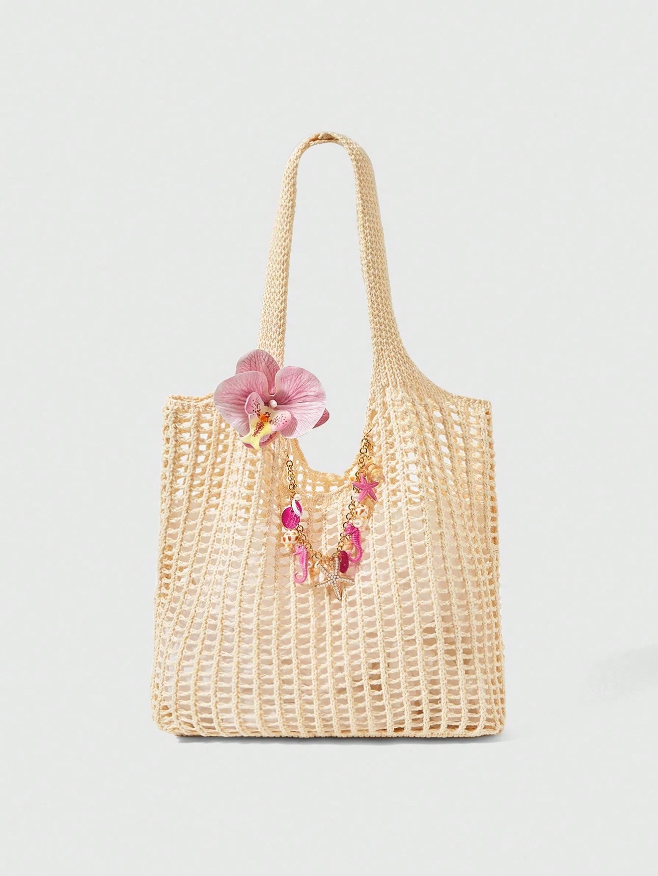 Fairycore 1 pieza Bolso de playa estilo bohemio con diseño calado, decoración floral tropical (decoración DIY con material incluido), bolso de mano para mujer para vacaciones en la playa