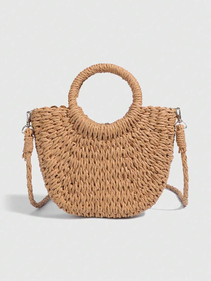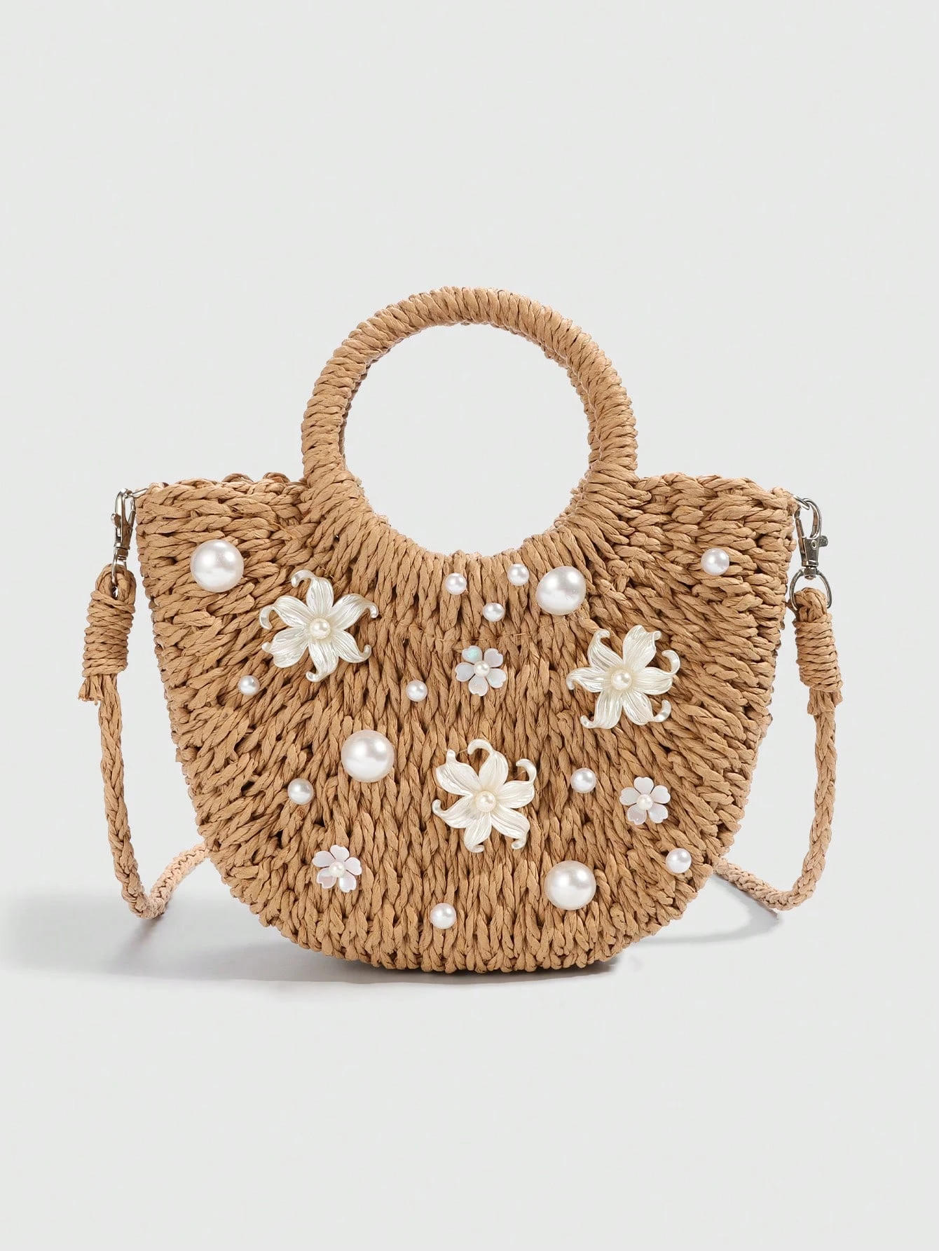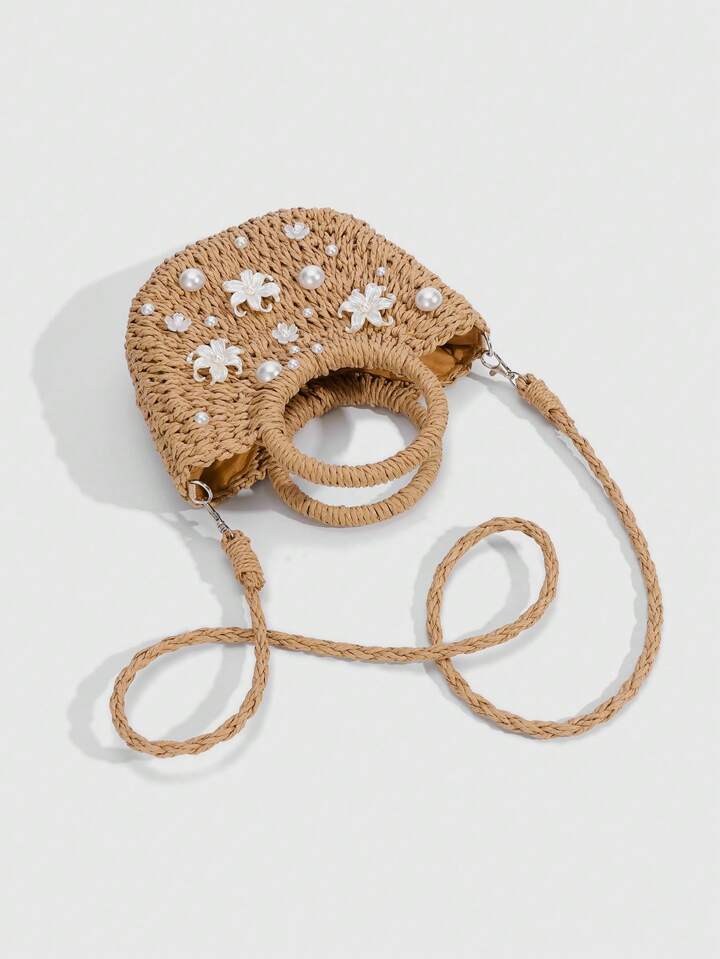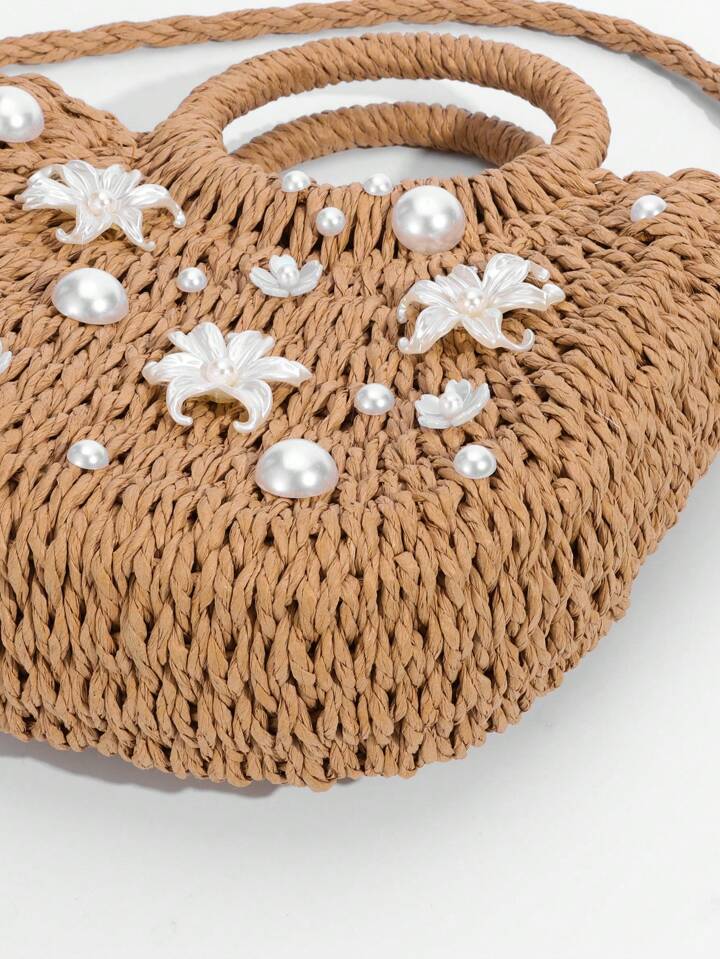 Fairycore 1 pieza Bolso de playa de paja decorado con estrella de mar y perlas, bolso de compras informal de estilo de resort de verano para mujer, color caqui