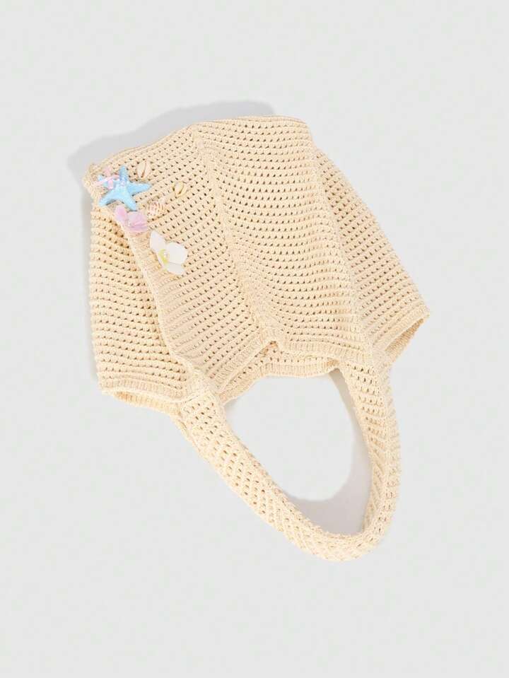 Fairycore 1 pieza Bolso de playa de mujer grande y con capacidad, de estilo de vacaciones en el océano tropical, con concha, estrella de mar y flor decorados, de tejido hueco en beige