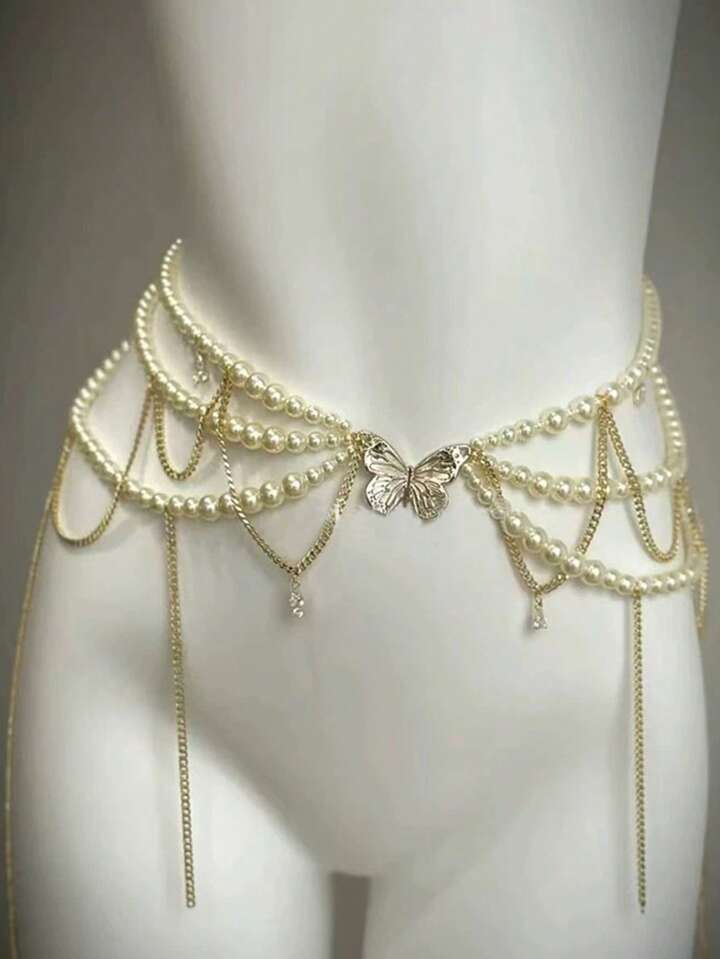Fairycore 1 pieza Cadena para la cintura de mujer con multicapas de perlas, diseño de mariposa y borlas