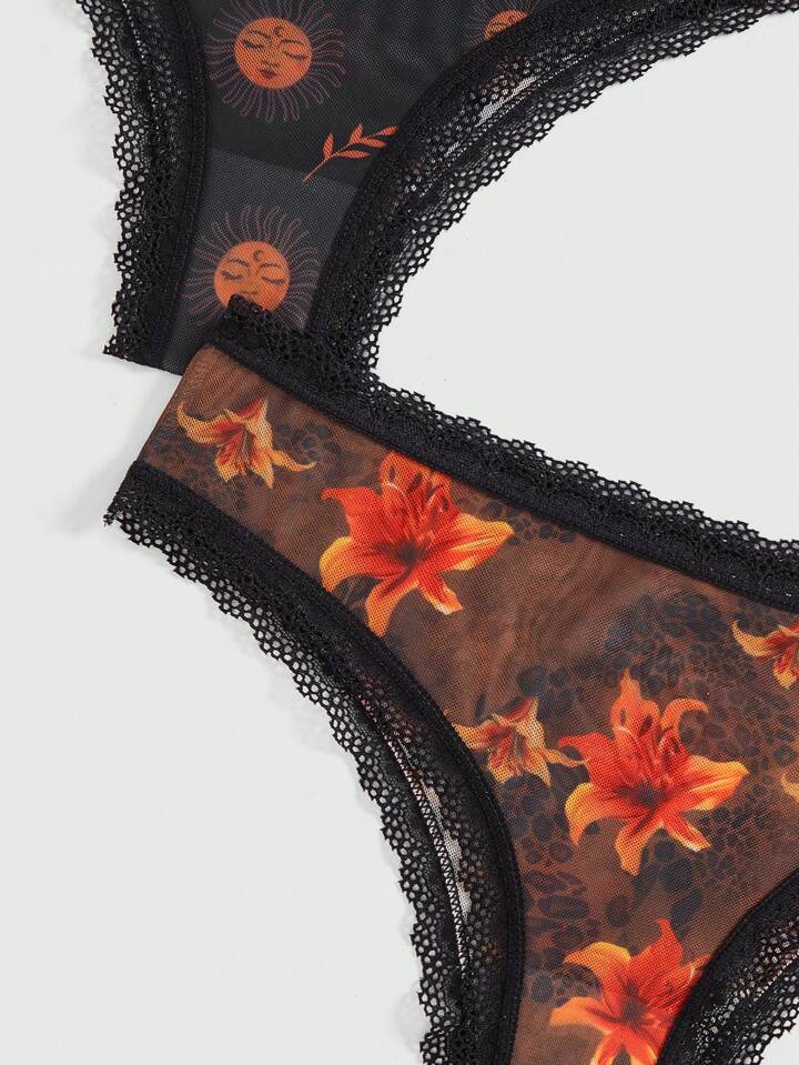 Fairycore 3 piezas Conjunto de ropa interior de tanga con estampado de mariposa, girasol y floral completo, con ribete de encaje para mujeres