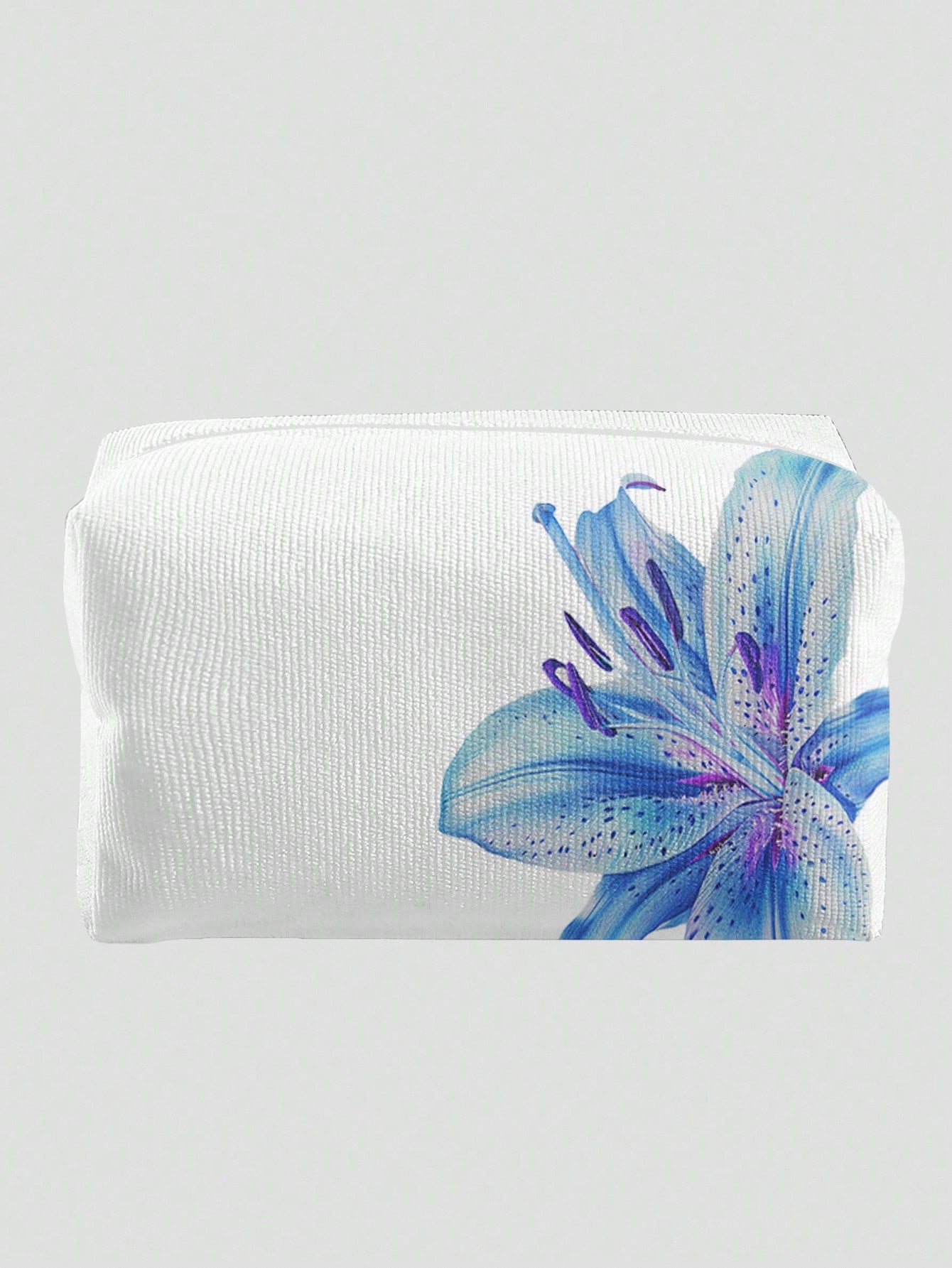Fairycore Bolsa de maquillaje de terciopelo con fondo blanco y estampado de flores de lirio azul