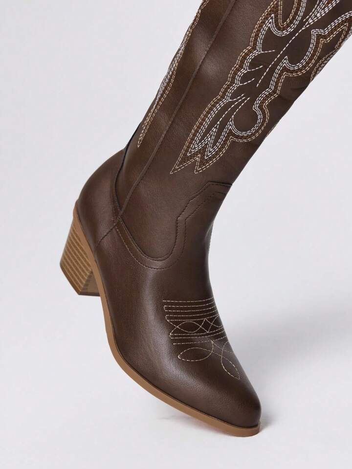 Fairycore Botas altas tipo occidental bordadas, estilo slip-on, de color marrón, zapatos de mujer de piel para primavera y otoño