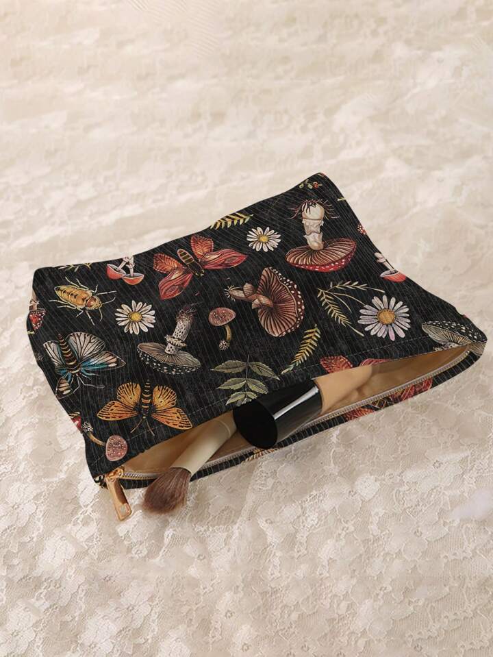 Fairycore Bolso de cosméticos de pana con estampado de doble cara de hongos de mariposa, insecto y otros patrones