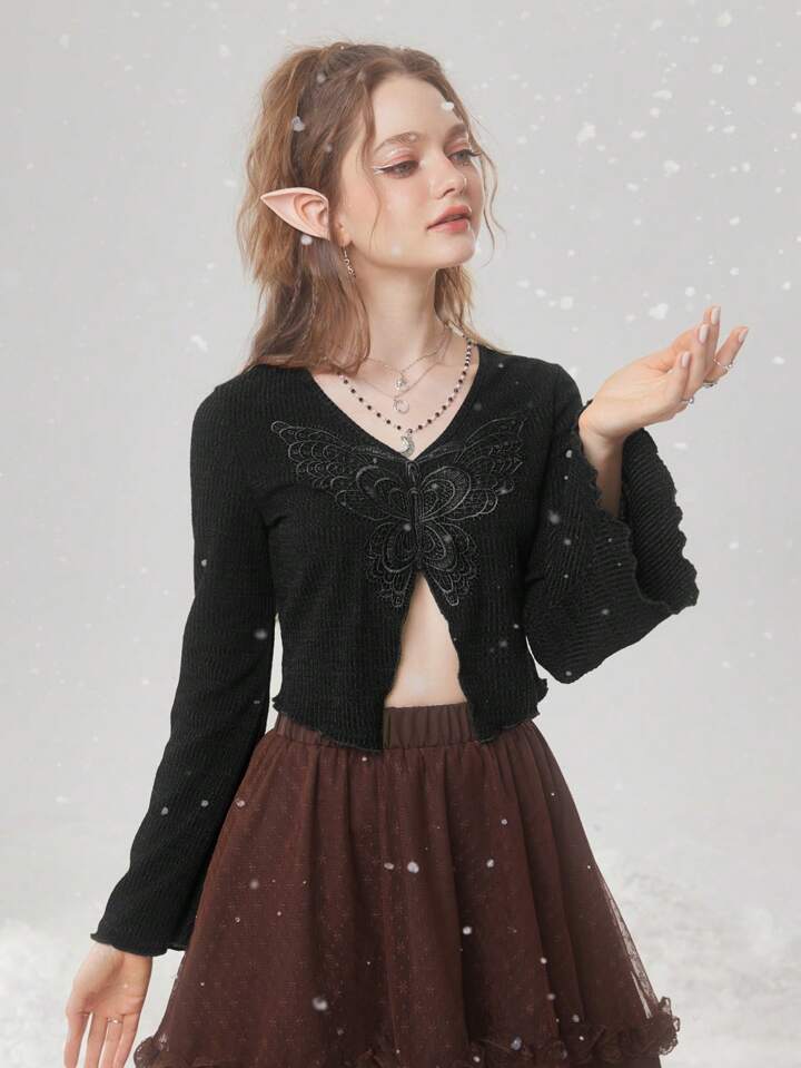 Fairycore Camiseta crop con parche de mariposa de manga con volante bajo asimétrico