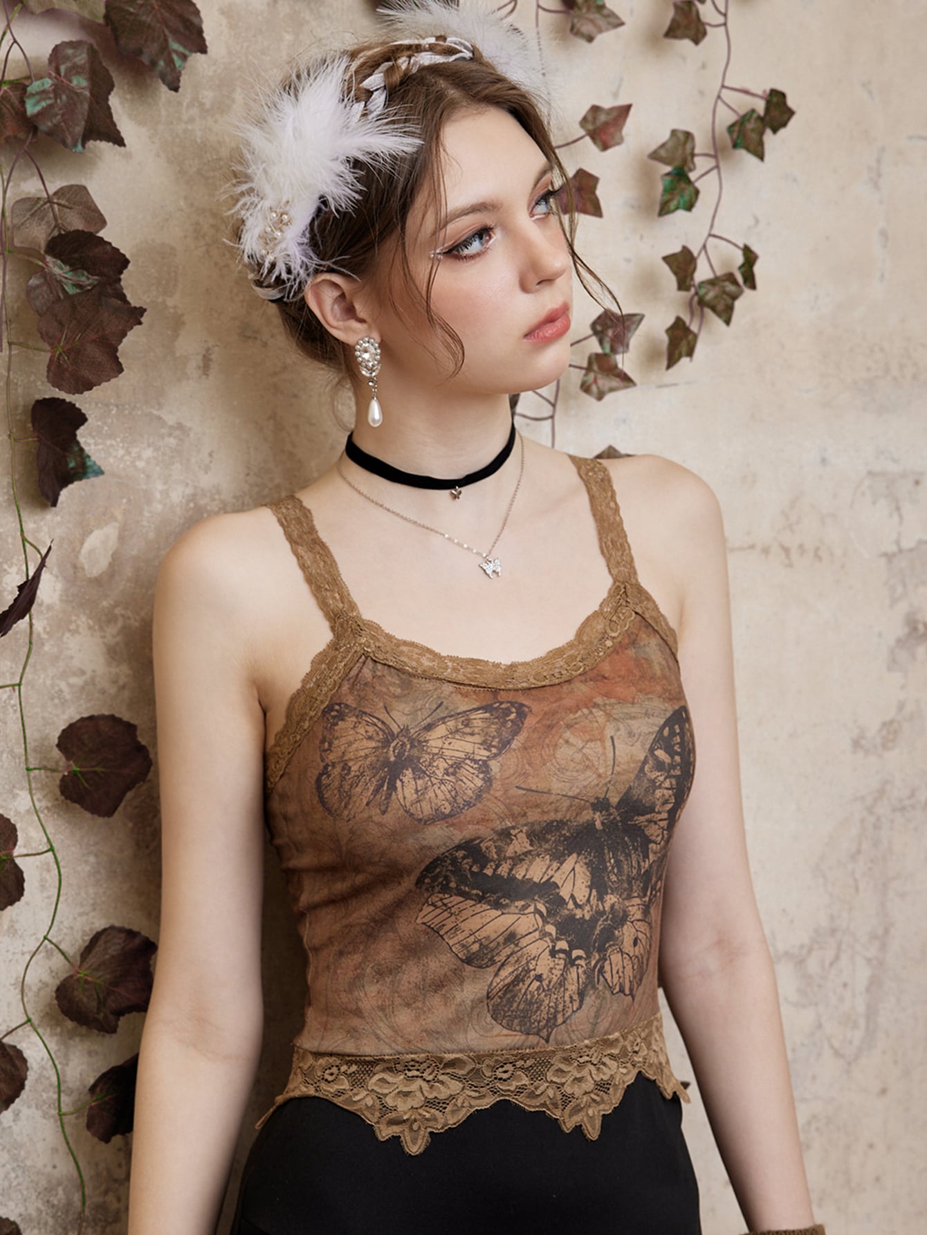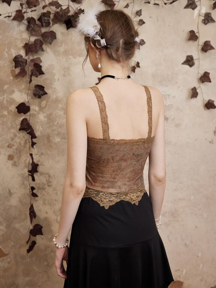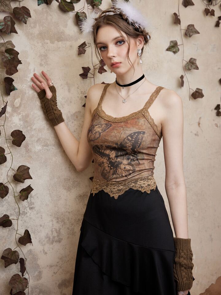 Fairycore Top de tirantes con estampado de mariposa ribete con encaje