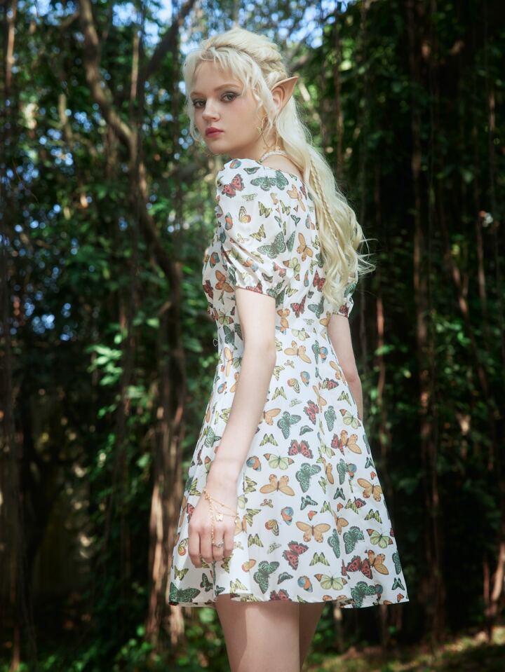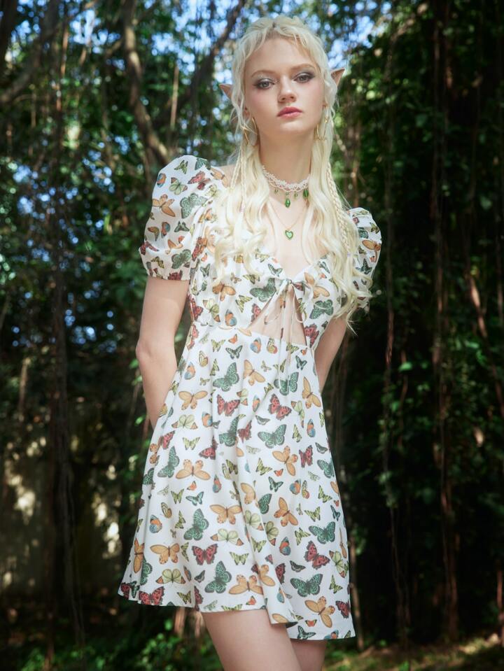 Fairycore Vestido con estampado de mariposa con cordón delantero de manga farol